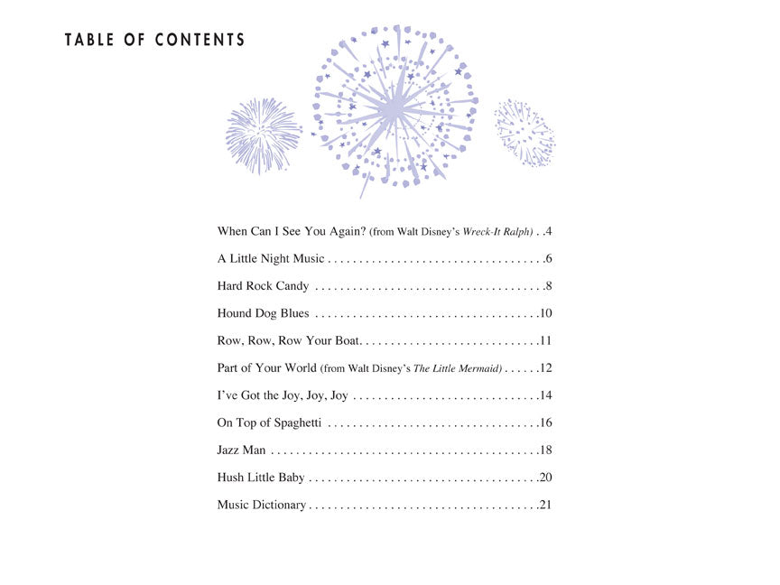 This special collection will let Primer Level students shine! A colorfulmix of carefully selected pieces from the PreTime® Piano Supplement This special collection will let Primer Level students shine! A colorful mix of carefully selected pieces from the PreTime® Piano Supplemental Library is very appealing to beginning piano students and offers instructional value to teachers. Songs include: Hard Rock Candy; Hound Dog Blues; Hush, Little Baby; I've Got the Joy, Joy Joy; Jazz Man; A Little Night Music; On Top of Spaghetti; Part of Your World; Row, Row, Row Your Boa!; and When Can I See You Again? (recorded by Owl City)!