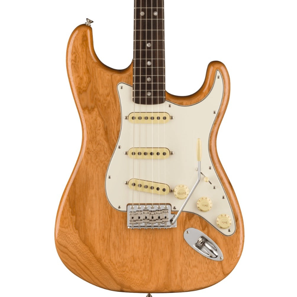 The American Vintage II 1973 Stratocaster® exudes the spirit of the era and is outfitted with a trio of Pure Vintage '73 staggered pole pickups, a large headstock with dual string trees, a convenient “Bullet” style truss rod nut and a three-bolt neck plate with Micro-Tilt™ mechanism. The “C”-shape maple neck plays like a dream with a 7.25” radius rosewood or maple fingerboard and vintage tall frets. The guitar is offered in three classic colors over ash: Aged Natural, Lake Placid Blue and Mocha, the latter being the first custom color ever to feature a black pickguard on a Strat®. Additional features include vintage-style “F” stamped tuners and a synchronized tremolo with bent steel saddles and cold rolled steel block.