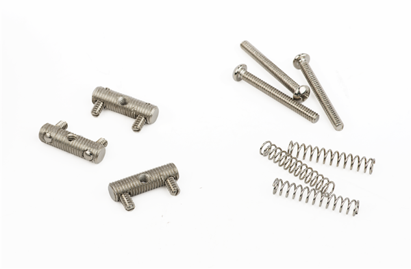 Set of three vintage-style threaded nickel-plated steel Telecaster® bridge saddles. Package includes saddles, intonation springs and screws, and saddle height adjustment screws.