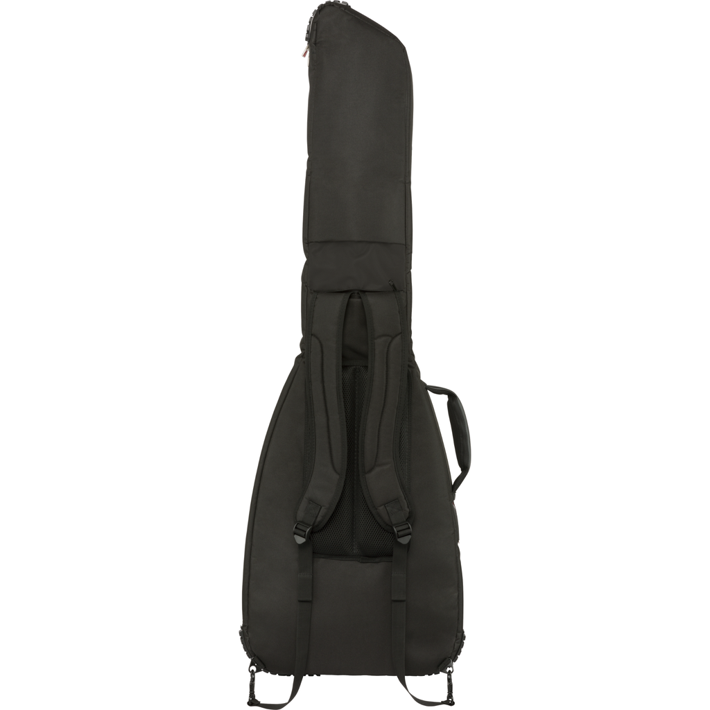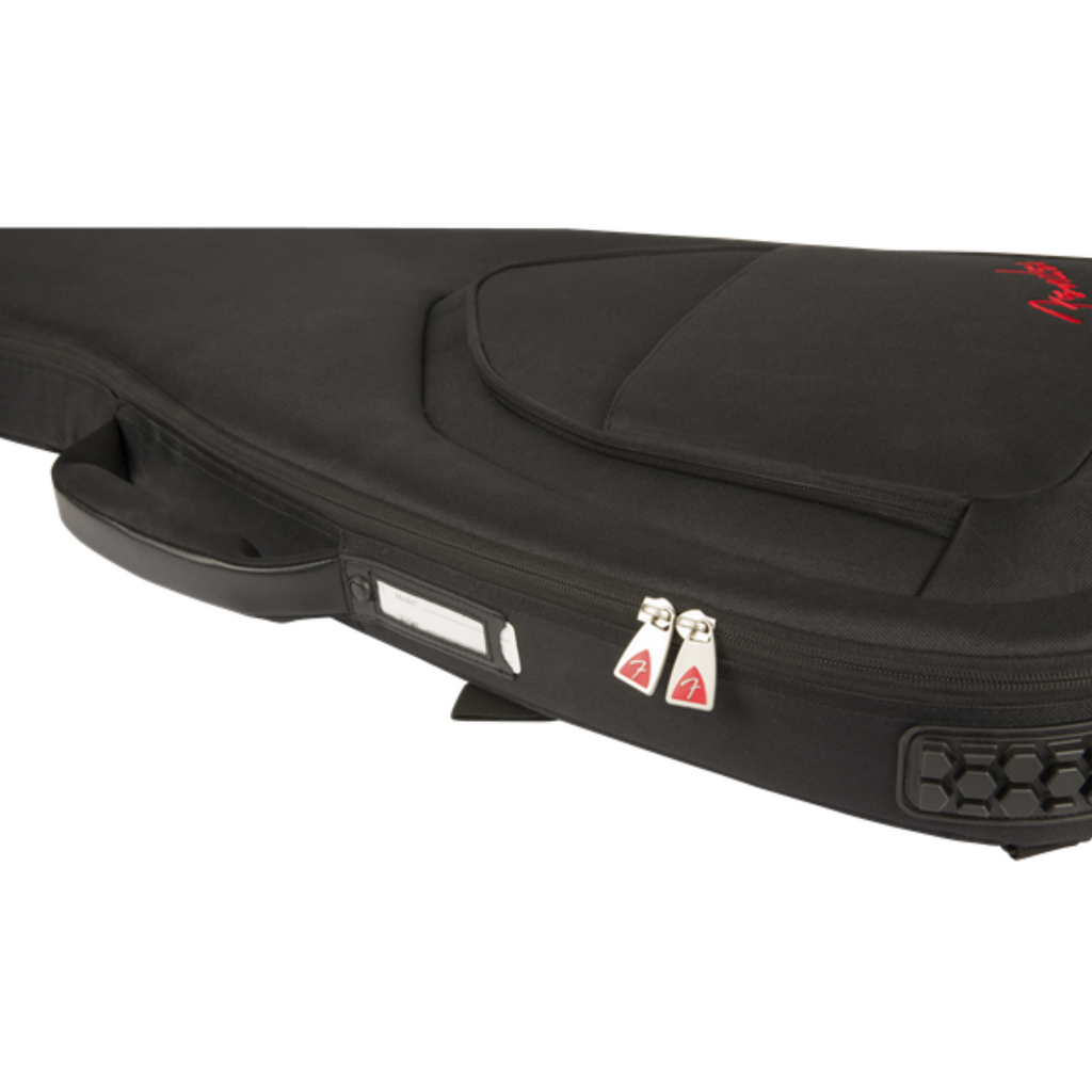 Fender's F620 Series gig bag is a stylish and secure way to keep your electric bass safe while traveling. Featuring the iconic asymmetrical Fender shape, its durable outer layer is constructed of tough 600 Denier polyester that protects against impacts while avoiding ripping and tearing. Its interior is filled with 20mm padding lined with soft touch microfiber that keeps your instrument secure while preventing finish damage. It even comes with strap button protection, a protective neck rest and exterior bumpers to minimize any strain on the instrument while in transit. The F620 gig bag also comes with a super-padded handle and ergonomic air mesh backpack straps with easily adjustable ladder lock buckles, so you can comfortably carry your instrument without unnecessary physical strain. Plus, it features plenty of storage space with its large front pocket and zippered backpack strap pocket. The front storage pocket offers space for small accessories and has a dedicated pocket for extra strings, a removable padded tool pouch, elastic pick pocket, elastic pen loop and a business card window.
