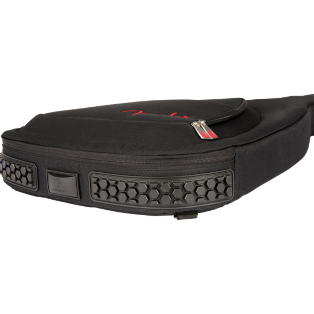 Fender's F620 Series gig bag is a stylish and secure way to keep your electric guitar safe while traveling. Featuring the iconic asymmetrical Fender shape, its durable outer layer is constructed of tough 600 Denier polyester that protects against impacts while avoiding ripping and tearing. Its interior is filled with 20mm padding lined with soft touch microfiber that keeps your instrument secure while preventing finish damage. It even comes with additional padding for strap button protection, a protective neck rest and exterior bumpers to minimize any strain on the instrument while in transit. The F620 gig bag also comes with a super-padded handle and ergonomic air mesh backpack straps with easily adjustable ladder lock buckles, so you can comfortably carry your instrument without unnecessary physical strain. Plus, it features plenty of storage space with its large front pocket and zippered backpack strap pocket. The front storage pocket offers space for small accessories and has a dedicated pocket for extra strings, a removable padded tool pouch, elastic pick pocket, elastic pen loop and a business card window.