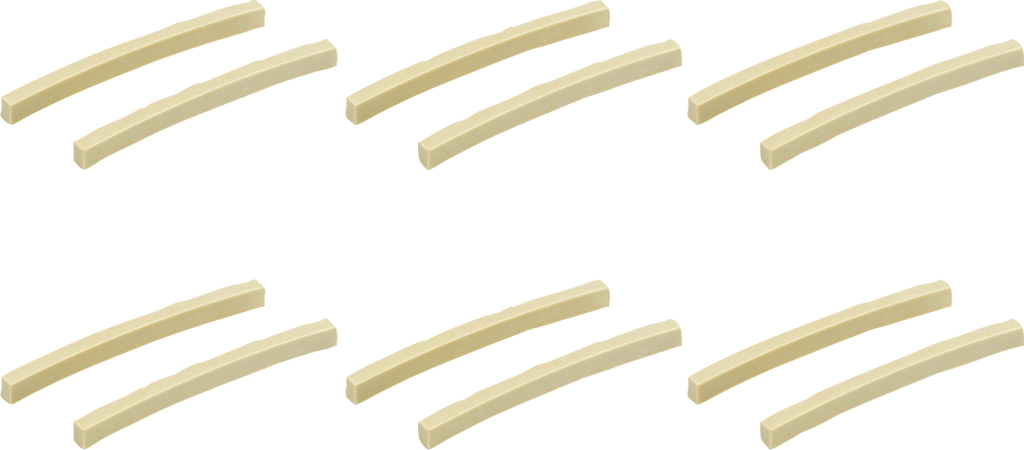 Set of two high-quality melamine (simulated bone) string nuts with 9.5" radius, for use with most Fender instruments (some modification required for correct fit).