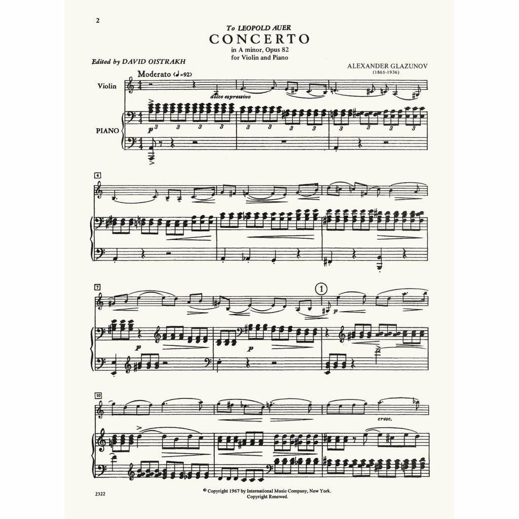 The Violin Concerto op. 82 is one of Glazunov's best-known works. Since the first performance in 1905 conducted by the composer, when Leopold Auer was the soloist, virtually all the great violinists have had it in their repertories. The structure of the work was fairly unconventional for its time. The lyrical and romantic first movement is followed without a break (attacca) by the striking and virtuoso second movement with its characteristic "alla caccia" themes.