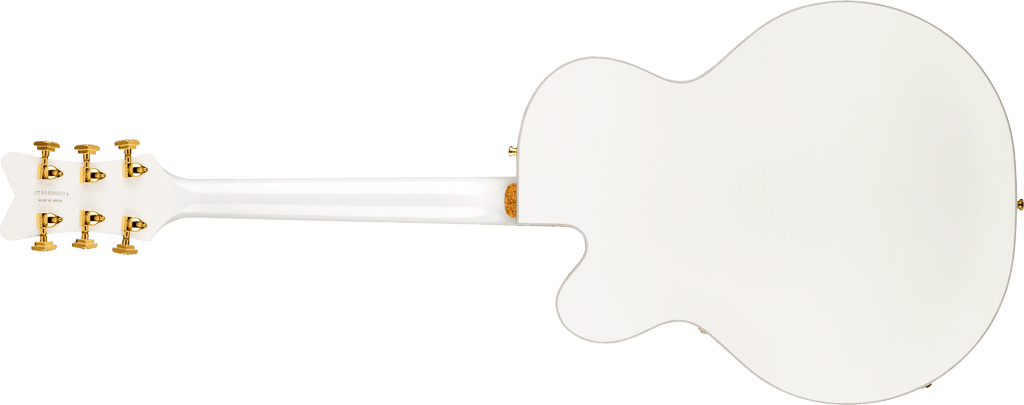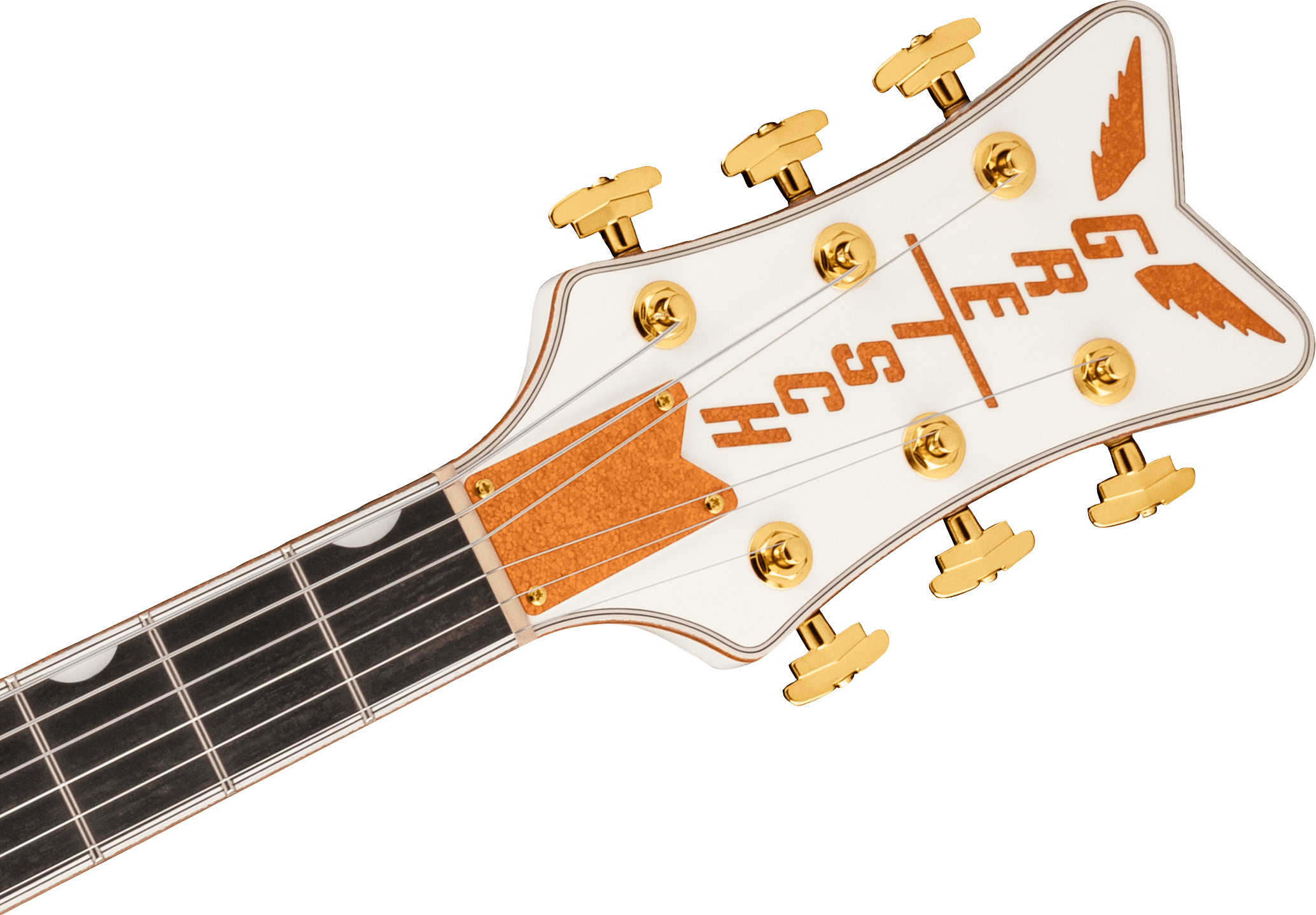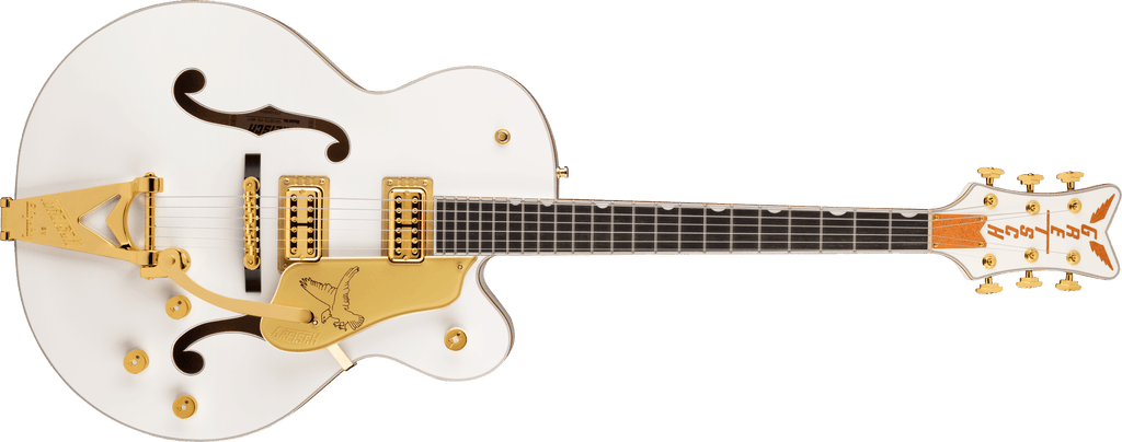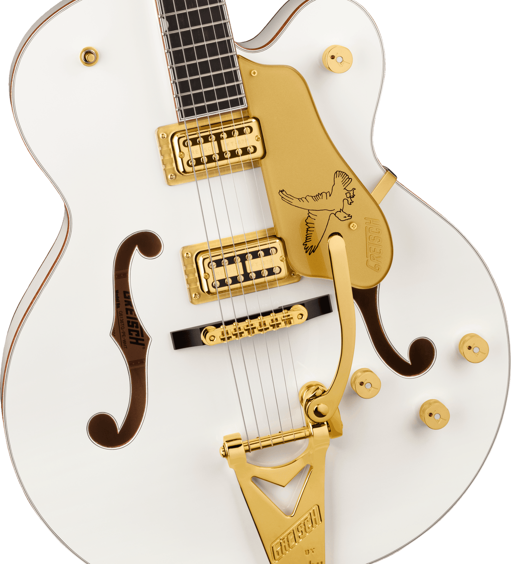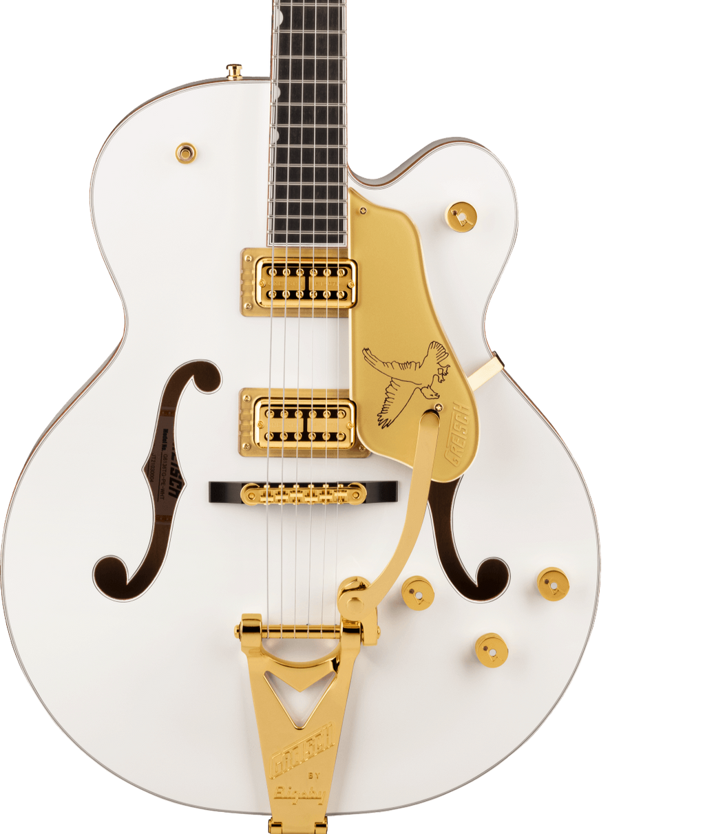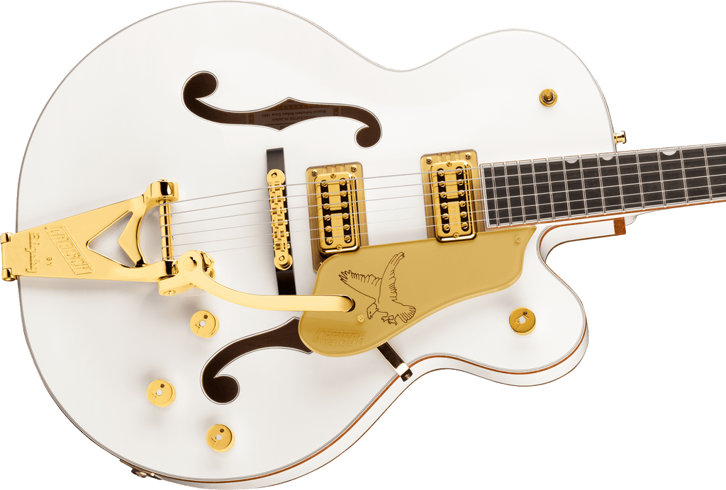 Boasting powerful sound and stage-ready tonal flexibility, this Falcon presents total sophistication - from the Midnight Sapphire or White gloss urethane finish to the gold Grover® Imperial™ locking tuning machines and gold jeweled G-arrow control knobs, to the gold sparkle bound neck, body and F-holes, to the striking pearloid Neo-Classic™ thumbnail inlays and gold vintage thick plexi pickguard with Gretsch and Falcon logos. A bold visual and sonic statement, the G6136TG Players Edition Falcon Hollow Body with String-Thru Bigsby and Gold Hardware updates the archetypical hollowbody electric guitar for modern players who demand distinction from themselves - and their tools.