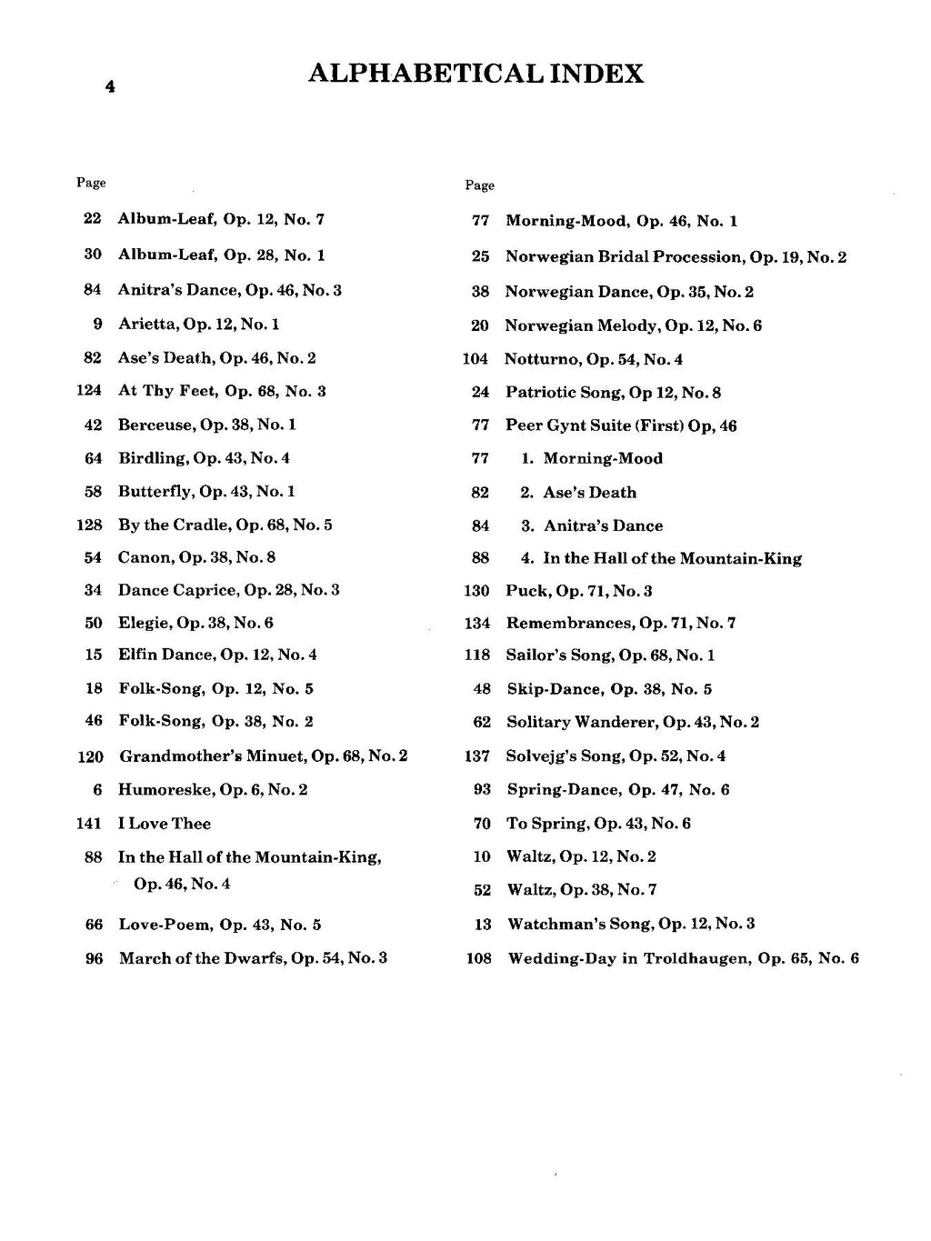 Norwegian composer Edvard Grieg wrote many small masterpieces. Included in this 144-page edition are 45 of his most popular and useful works, including "Anitra's Dance," "Peer Gynt Suite,: "March of the Dwarfs," and "Wedding-Day in Troldhaugen." Fingering, phrasing, pedaling and dynamics that underscore the musical structure have been added by editor Henry Levine. Included is a very insightful biography on Grieg as well as a thematic index.