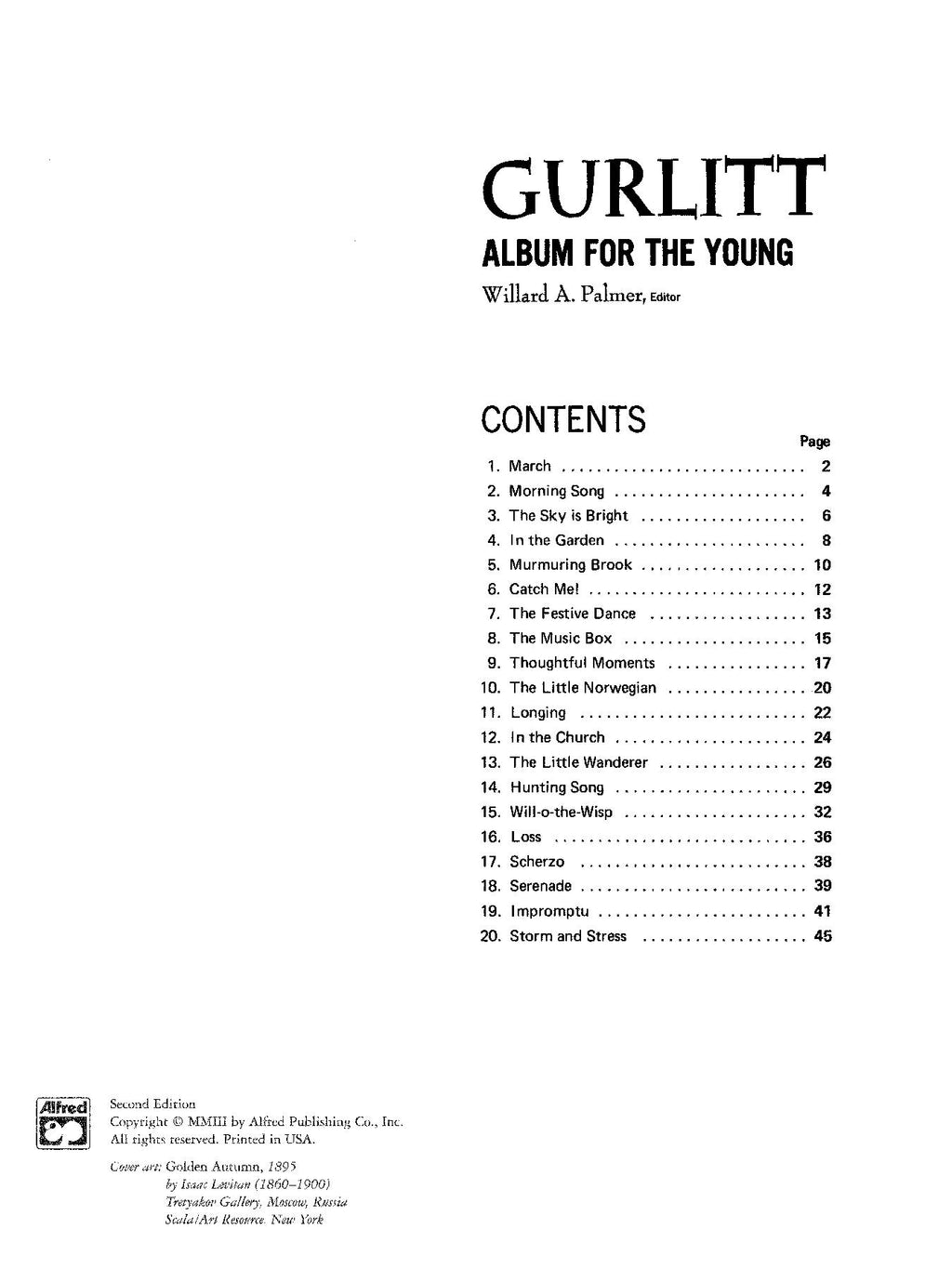 Reminiscent of Schumann's and Tchaikovsky's collections with the same title, Gurlitt's Album for the Young is a whimsical set of 20 character pieces. Each work contains a descriptive title, which is often reflective of nature or a standard piano composition. Many of the selections assist students in developing phrasing, articulation, finger dexterity and melodic voicing.