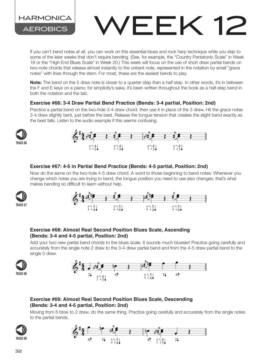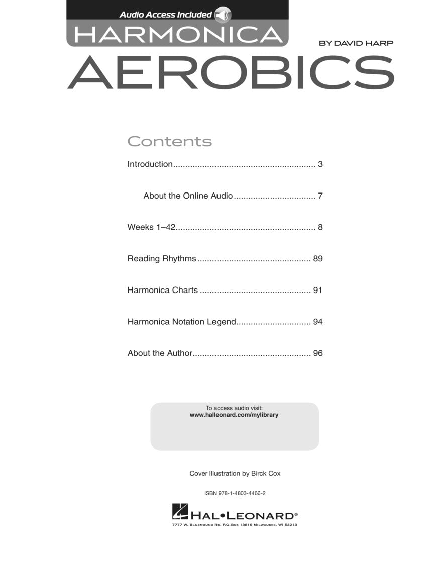 Harmonica Aerobics offers a 42-week regimen to help you play to your full potential. Whether you're a beginning or more experienced player, it's all here. The exercises include playing single notes and chords, bending notes, chord progressions, rhythmic precision, improvisation, strengthening your mouth and tongue, increasing your lung capacity, and much more, including audio tracks for helpful practicing. The audio is accessed online using the unique code inside each book and can be streamed or downloaded. The audio files include PLAYBACK+, a multi-functional audio player that allows you to slow down audio without changing pitch, set loop points, change keys, and pan left or right.