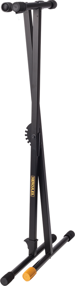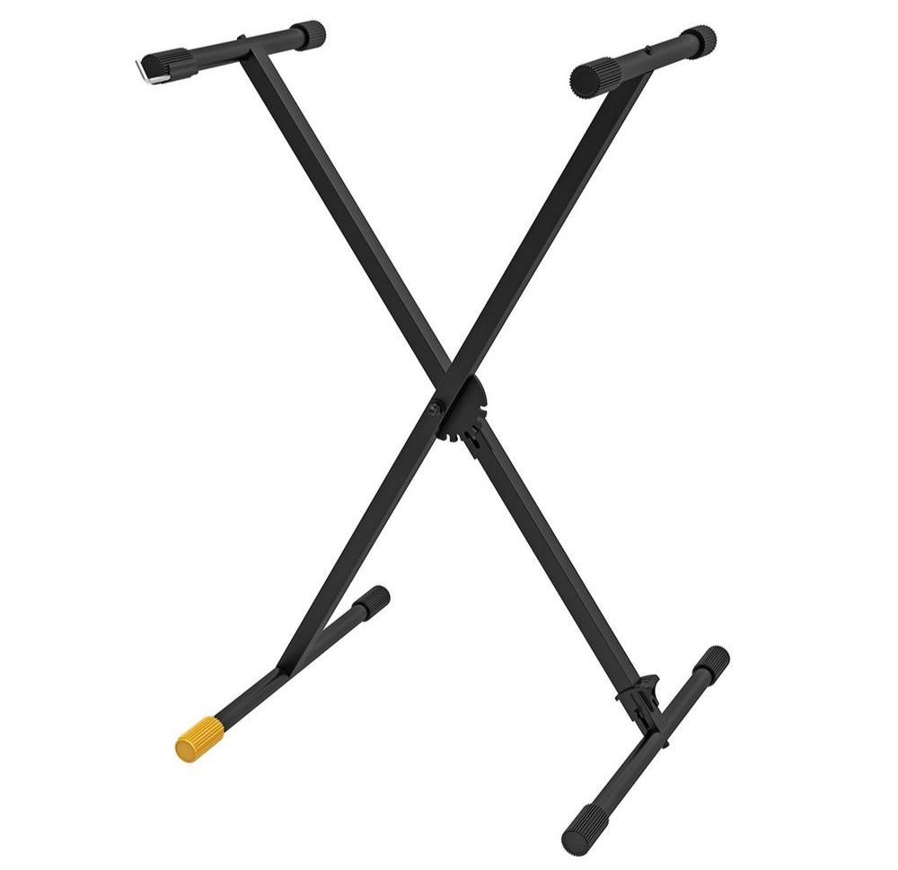 Hercules KS100B EZ Step Keyboard Stand. It features a collapsible foldable design, stores in 88% of the space it takes to store a full size keyboard stand, stand sets to 6 different positions with a foot pedal trigger.