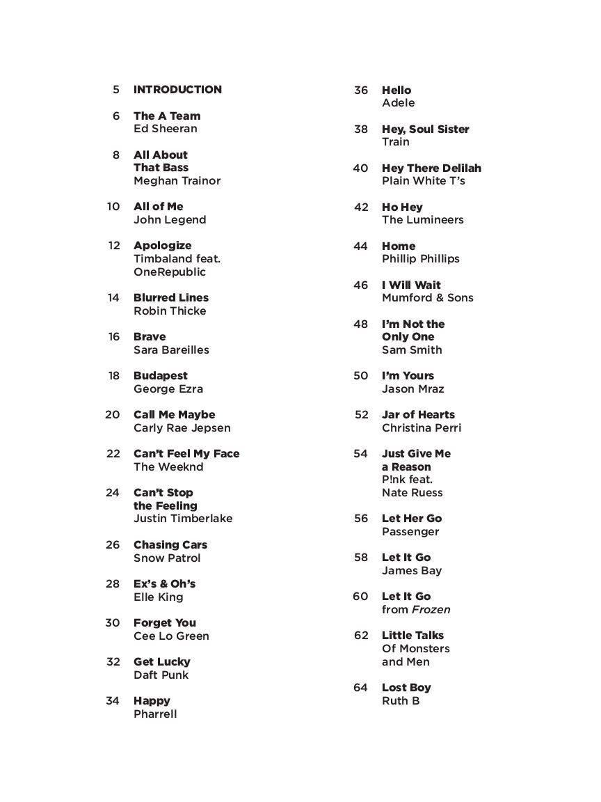 The A Team All About That Bass All Of Me Apologize Blurred Lines Brave Budapest Call Me Maybe Can't Feel My Face Can't Stop The Feeling! Chasing Cars Ex's & Oh's Forget You Get Lucky Happy Hello Hey, Soul Sister Hey There Delilah Ho Hey Home I Will Wait I'm Not The Only One I'm Yours Jar Of Hearts Just Give Me A Reason Let Her Go Let It Go Let It Go Little Talks Lost Boy Love Yourself Mean No One One Call Away 100 Years Poker Face Renegades Riptide Roar Rolling In The Deep Royals Say Something See You Again 7 Years Shake It Off She Will Be Loved A Sky Full Of Stars Some Nights Stay Stay With Me Stitches Story Of My Life Take Me To Church Tear In My Heart Thinking Out Loud A Thousand Years Uptown Funk Viva La Vida The Walker When I Was Your Man