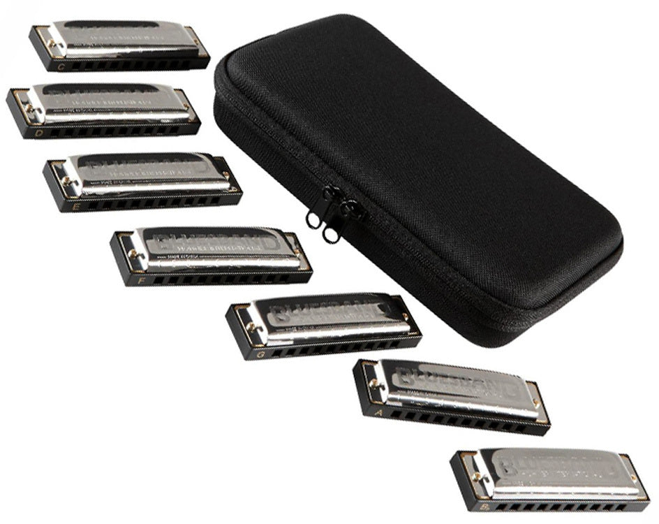 - Includes 7 Hohner Bluesband Harmonicas in the following keys - C, D, E, F, G, A, Bb