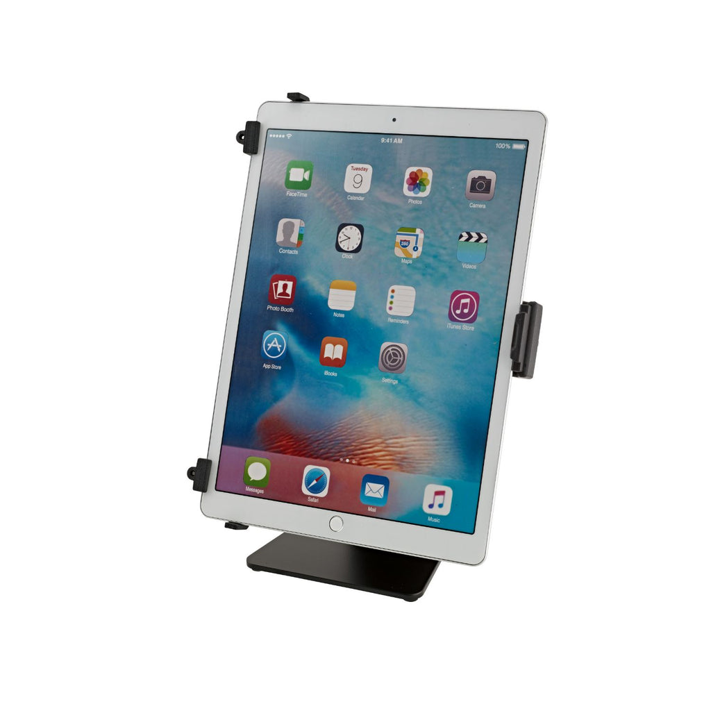 Stable Table Stand with Universal Tablet Holder for different models. With this high quality table stand your tablet is always close by, should you be reading, surfing the Internet or just watching videos or looking at pictures. The individually adjustable support arms can accommodate the use of tablets ranging in height from 222 to 334 mm and width from 128 to 232 mm (for example iPad, iPad Air, iPad Pro, Amazon Fire HDX 8.9, Samsung Galaxy Tab from 9.7, Google Nexus 9, Asus Transformer or Microsoft Surface as well as Surface Pro). The depth of the tablets can vary between 6 and 11 mm. For the first use of the tablet holder the support arms settings are made by adjusting the clamp screws to the size and depth of the tablet. For other uses the tablet can be attached and detached quickly and simply through a snap lock. The holder will hold the tablet safe and secure. A handy wing nut allows one to adjust the angle, so that each user will easily be able to find their ideal individual position. The tablet can switch between portrait and landscape positions. The tablet is kept in place, there is no danger of the tablet switching position by itself.