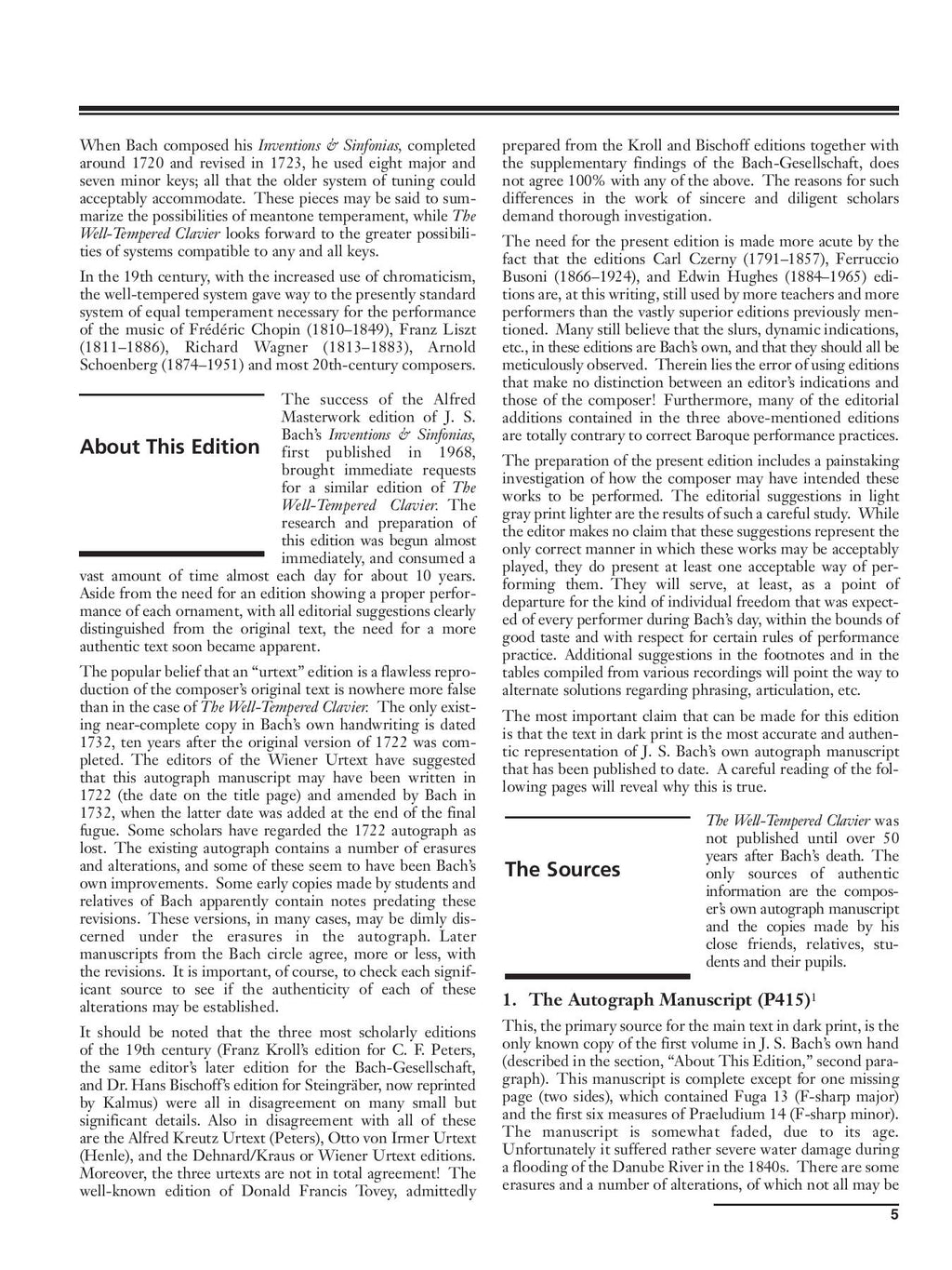 A most impressive 220-page edition of the first volume of "The Well-Tempered Clavier," these 24 preludes and 24 fugues were painstakingly researched over a period of 10 years, using the most important original manuscript sources. Baroque scholar Willard A. Palmer's thorough introduction discusses fugal construction, articulation and other aspects of performance interpretation. Volume I of "The Well-Tempered Clavier" has been updated with a new "look" to match Volume II. This essential masterpiece is a "must-have" for all pianists. The comb binding creates a lay-flat book that is perfect for study and performance.