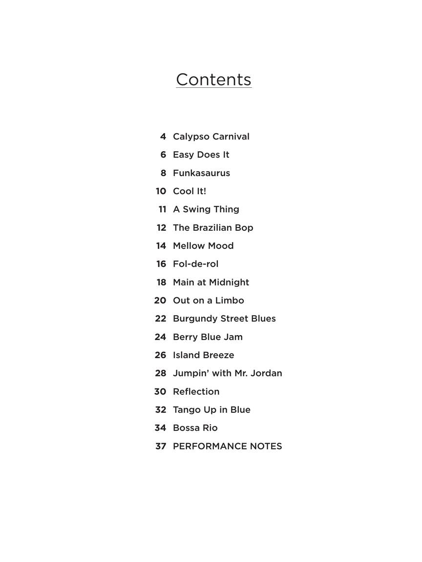 17 great pieces written to help a student become familiar with various jazz styles. They progress from later elementary to mid-intermediate level and may be used with the Jazz Piano Basics series or as independent solo recital pieces! Several of the pieces were previously in the Jazz Connection series. Includes online audio files as well as in-depth performance notes by the composer. Titles: Berry Blue Jam • Bossa Rio • The Brazilian Bop • Burgundy Street Blues • Calypso Carnival • Cool It! • Easy Does It • Fol-de-rol • Funkasaurus • Island Breeze • Jumpin' with Mr. Jordan • Main at Midnight • Mellow Mood • Out on a Limbo • Reflection • A Swing Thing • Tango Up in Blue.