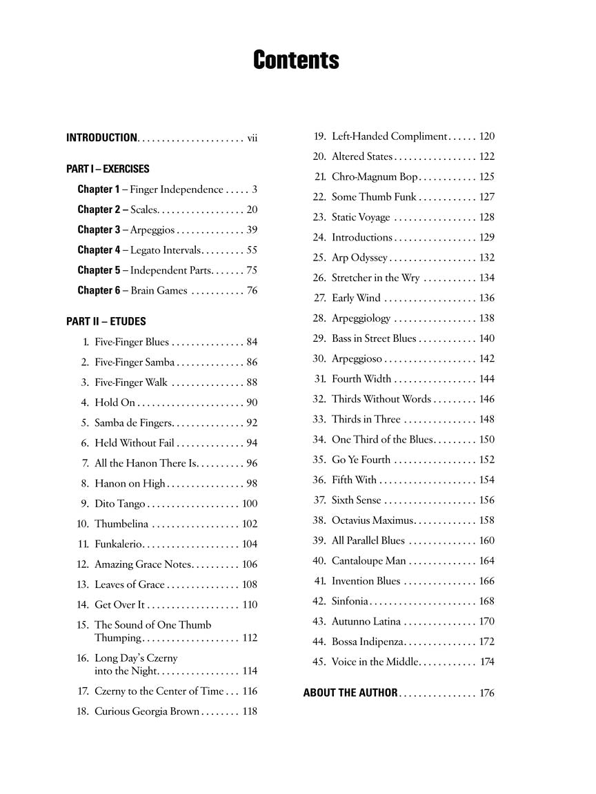 Topics include: scales (major, minor, chromatic, pentatonic, etc.), arpeggios (triads, seventh chords, upper structures), finger independence exercises (static position, held notes, Hanon exercises), parallel interval scales and exercises (thirds, fourths, tritones, fifths, sixths, octaves), and more! The book includes 45 recorded examples that are accessed online via download or streaming.