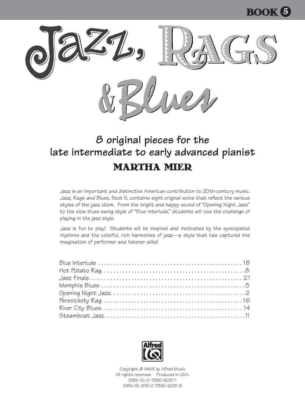 Due to numerous piano teacher and student requests, Martha Mier has written Book 5 in her best-selling Jazz, Rags & Blues series. Titles: Blue Interlude * Hot Potato Rag * Jazz Finale * Memphis Blues * Opening Night Jazz * Persnickety Rag * River City Blues * Steamboat Jazz.