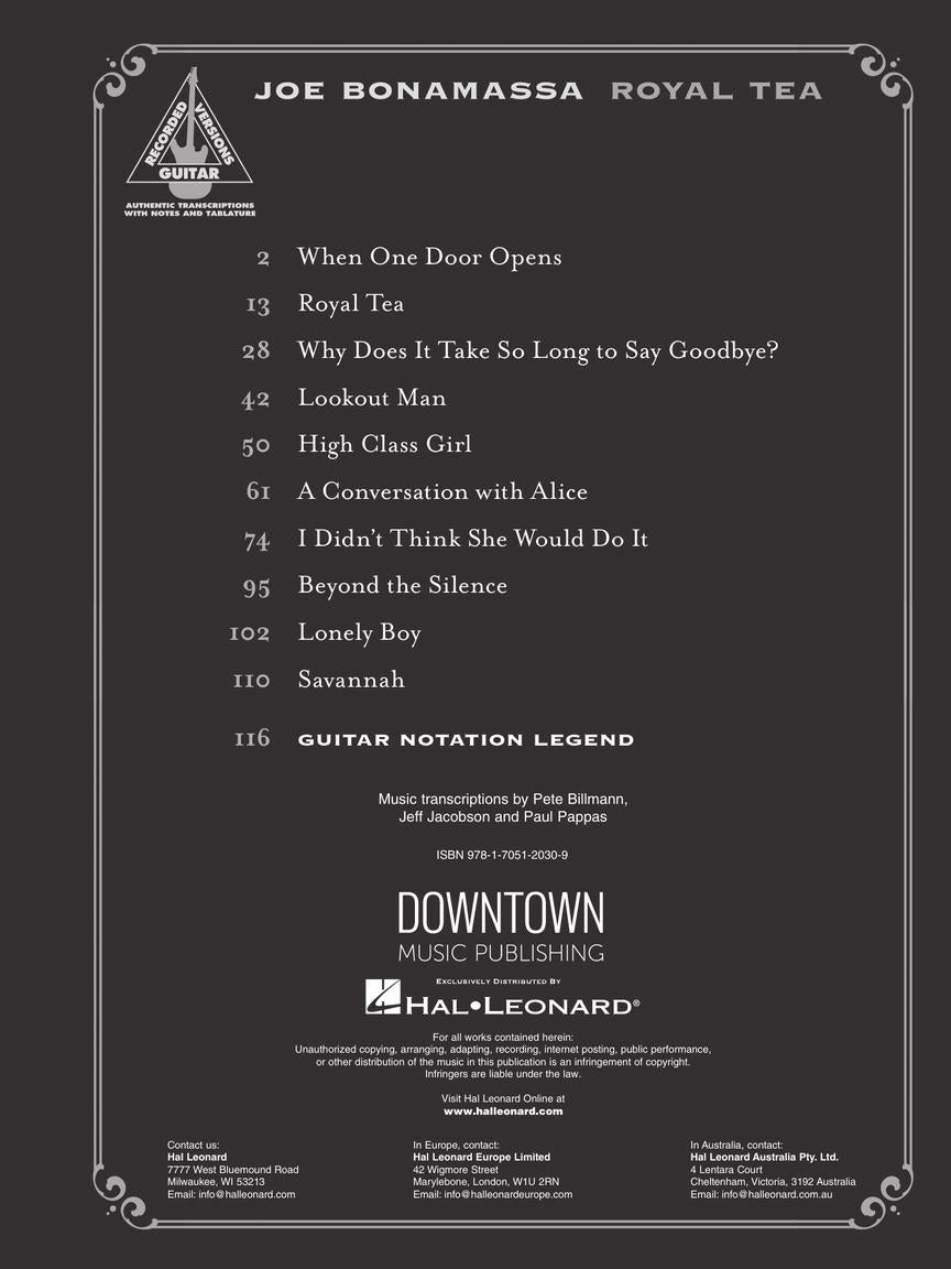 Inspired by his British heroes including Jeff Beck, John Mayall, Eric Clapton, Led Zeppelin and Cream, this 2020 album by blues guitar icon Joe Bonamassa was recorded at the famed Abbey Road Studios. This collection features note-for-note guitar transcriptions for all 10 original tracks on the album: Beyond the Silence • A Conversation with Alice • High Class Girl • I Didn't Think She Would Do It • Lonely Boy • Lookout Man • Royal Tea • Savannah • When One Door Opens • Why Does It Take So Long to Say Goodbye?