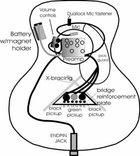 The system arrives fully assembled with TRSS stereo endpin jack wired in mono, so a standard guitar cable can be used. No soldering is necessary. The system also includes a Velcro-mounted battery holder and a volume control unit with individual thumbwheels for pickup and microphone. The volume control is mounted on the inside edge of the sound hole.