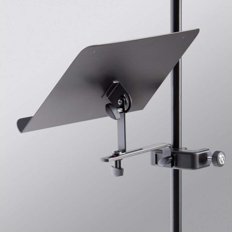 The position (angle) and depth to the stand tube of the tilting 300 x 200 mm sheet music holder is adjustable. The music desk has a depth of 30 mm. The flexible clamp makes it easy to mount the holder in a wide variety of directions. The clamp can be attached to tables (0 to 53 mm thickness). The sturdy metal frame of the clamp is equipped with high-quality plastic inserts and the non-slip coating ensures that the clamp provides a secure and powerful hold. Thanks to the specially formed clamping surface, the clamp can be used on flat surfaces such as tables or shelfing, as well as on round tubing. The holder is collapsible for easy transport.