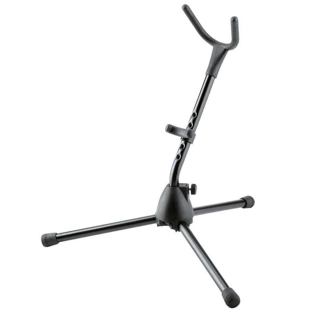 Adjustable folding stand for Eb Alto and Bb Tenor Sax. Fiberglass reinforced plastic base. Flexible upper support arm for different bell sizes. Lower support arm bracket with several vertical locking positions. All instrument support parts covered with exclusive non-marring plastic coating. To be used with peg holder 14301 and clarinet peg or with peg holder, adapter 15281 and pegs for trumpet, soprano sax or flugelhorn.