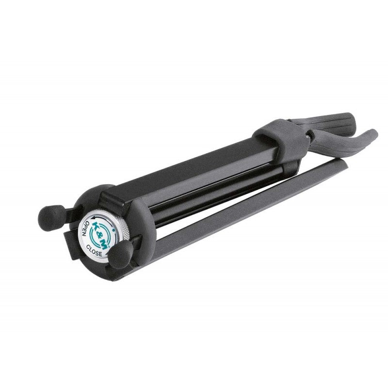 Practical, easy to use and stable stand for tenor saxophones. Solid square-type aluminium tubes with a large central locking screw, protective rubber bumps where stand connects with the saxophone body and the bell. Embedded foot end caps. Folds compactly, can be transported in the supplied velour bag in the saxophone bell.