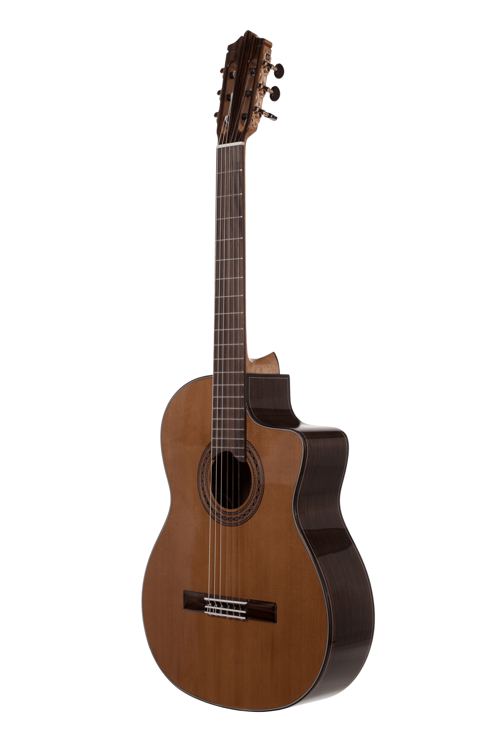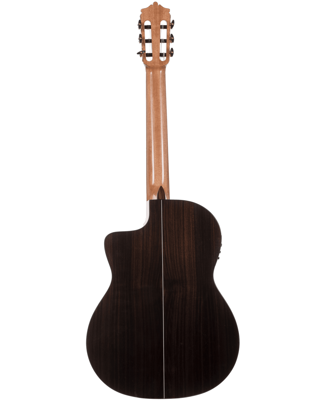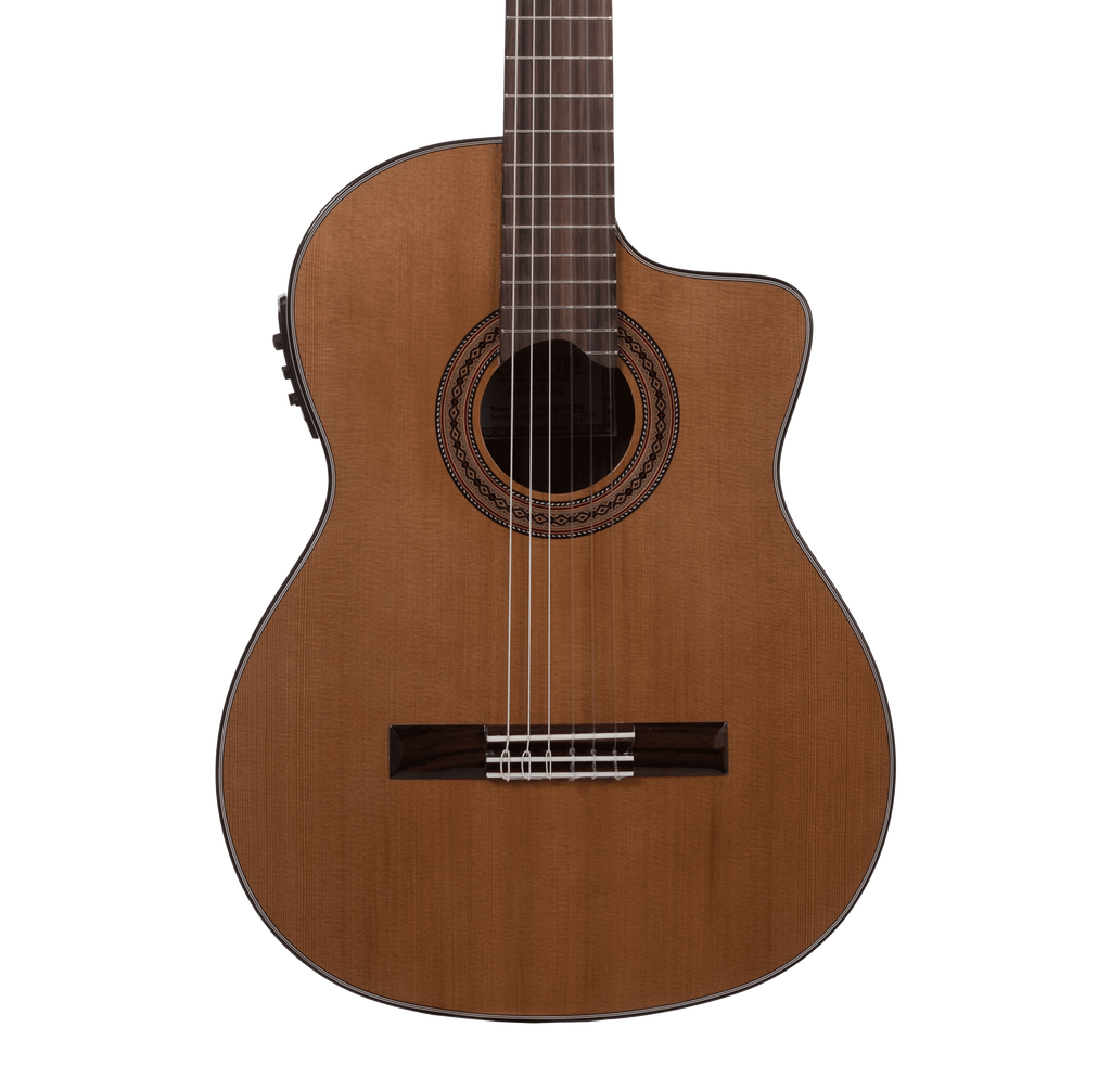 One of Katoh’s most popular student guitars. Accessible and beautiful. The MCG50CEQ features a solid cedar top and rosewood back and sides that provide rich tones. Like all Katoh guitars the MCG50CEQ is a very playable guitar. Venetian cutaway and Fishman electronics complete the package, for a go anywhere performance instrument. This particular model has everything one would desire in a classical guitar; a warm and balanced tone, aesthetically pleasing high gloss finish, and playability that is undeniable.