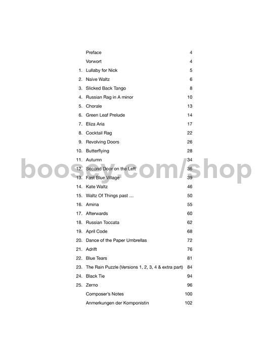 Some titles like Autumn, Blue Tears and Zerno are more reflective, Russian Toccata and Dance of the Paper Umbrellas verge on the virtuosic, then there are works like Black Tie, Slicked Back Tango and Cocktail Rag which are best described as party pieces. The collection also includes Eliza Aria and Russian Rag, two of Elena's greatest hits.