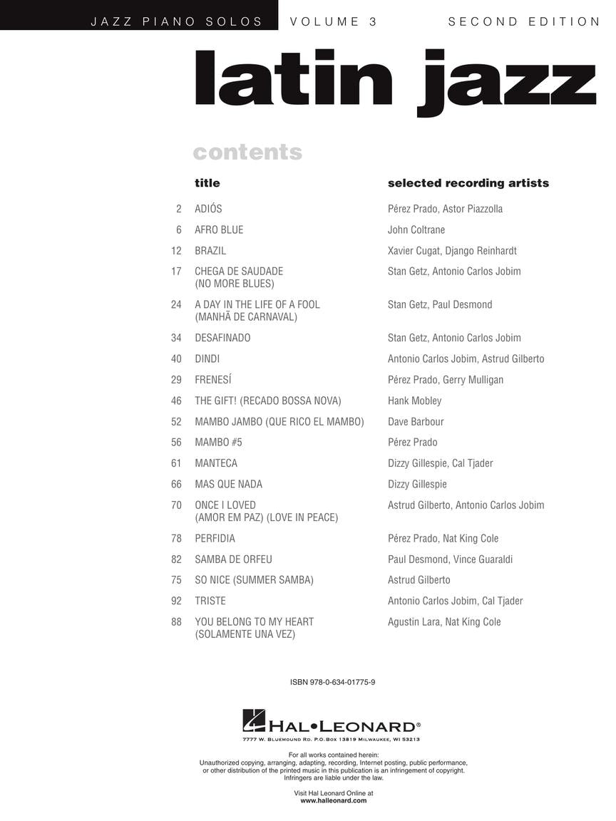 17 Latin jazz classics, including: Adios (Perez Prado, Astor Piazzolla) • Brazil (Xavier Cugat, Django Reinhardt) • A Day in the Life of a Fool (Stan Getz, Paul Desmond) • Desafinado (Stan Getz, Antonio Carlos Jobim) • Mambo #5 (Perez Prado, Xavier Cugat) • Manteca (Dizzy Gillespie, Cal Tjader) • Mas Que Nada (Dizzy Gillespie) • Perfidia (Perez Prado, Nat King Cole) • Samba De Orfeu (Paul Desmond, Vince Guaraldi) • Triste (Antonio Carlos Jobim, Cal Tjader) • and more. Includes chord names.