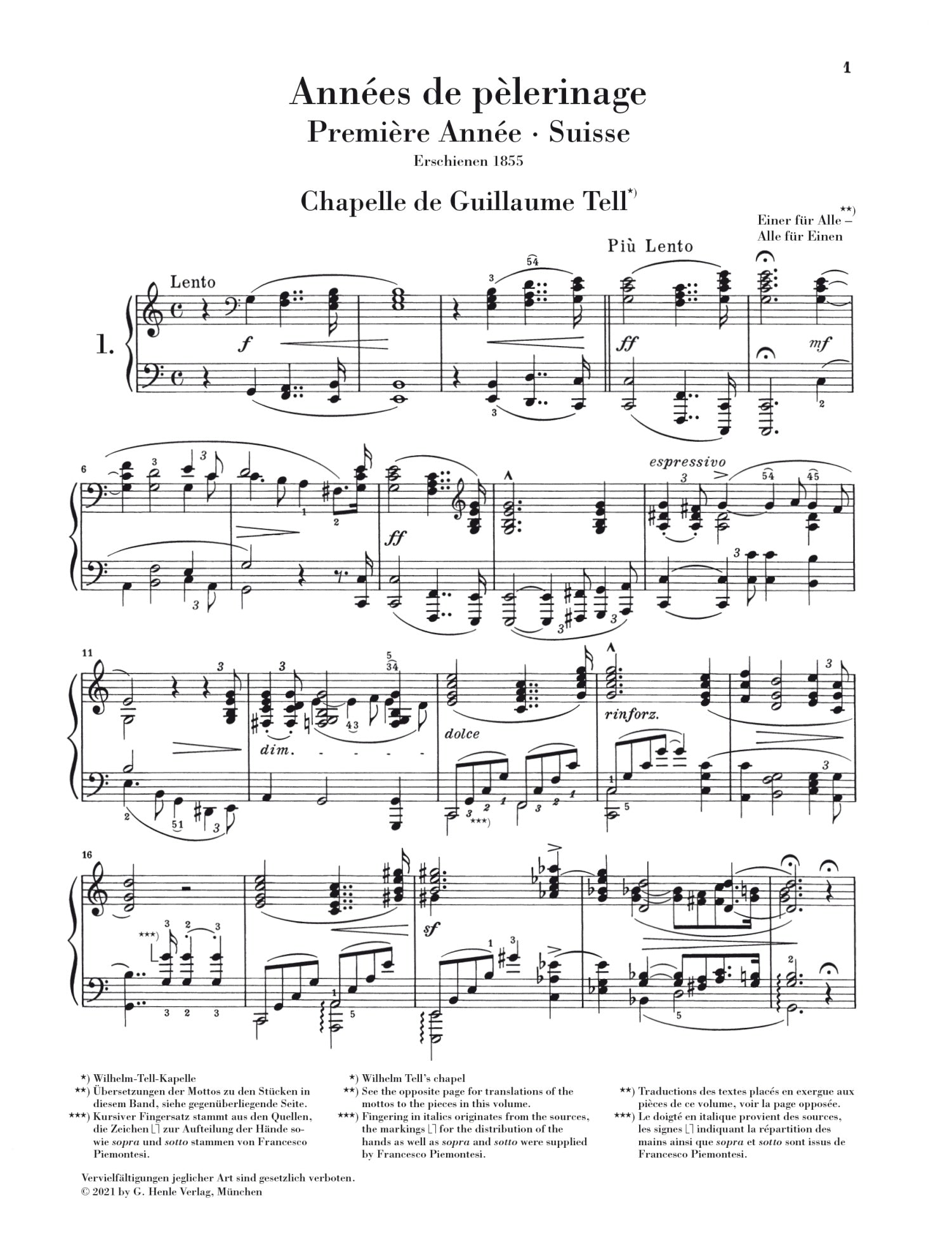 The three volumes of the “Années de pèlerinage” belong to the core of Liszt’s piano oeuvre. In the first volume, “Suisse”, the composer realised impressions of an extended sojourn in Switzerland in 1835/36. The pieces, for the most part published already in 1840/41, were later substantively reworked by Liszt, and the collection enlarged by two numbers, until it received its final form in 1855. For the revision of the Henle Urtext edition, it was possible for the first time to also take into account the engraver’s copy of the first edition that was once again accessible. The resulting modification in the weighting of the sources and further important new findings in Liszt research are presented in detail in the preface and the comments. We were able to enlist the Swiss pianist Francesco Piemontesi for the fingerings.