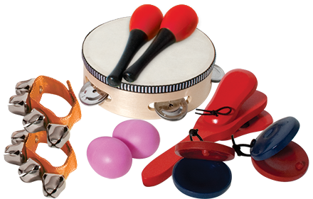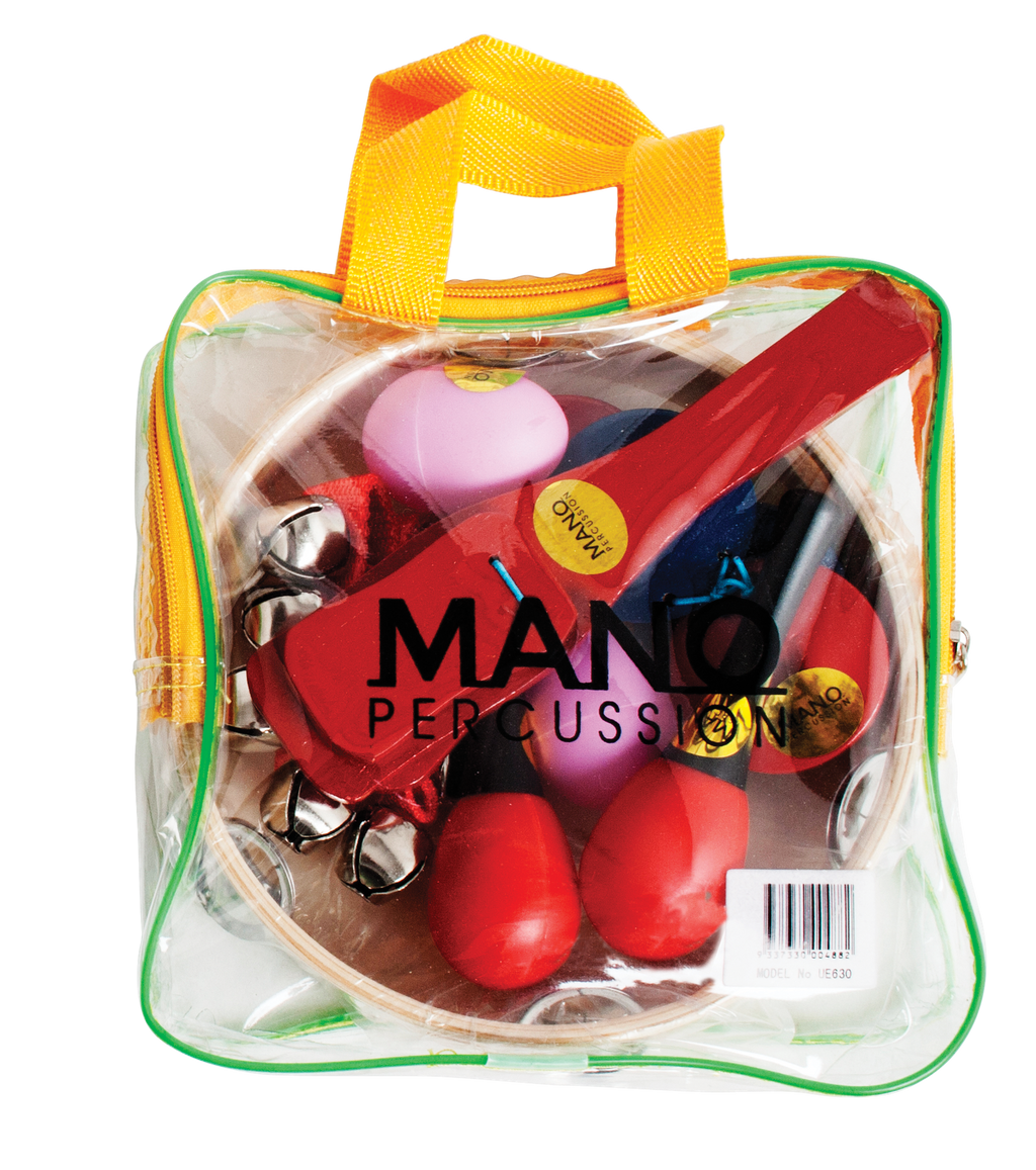 Includes 6 inch half moon tambourine with head, wooden handle castanet, one pair each of egg maracas, egg handle maracas, wooden finger castanets and wrist bells.