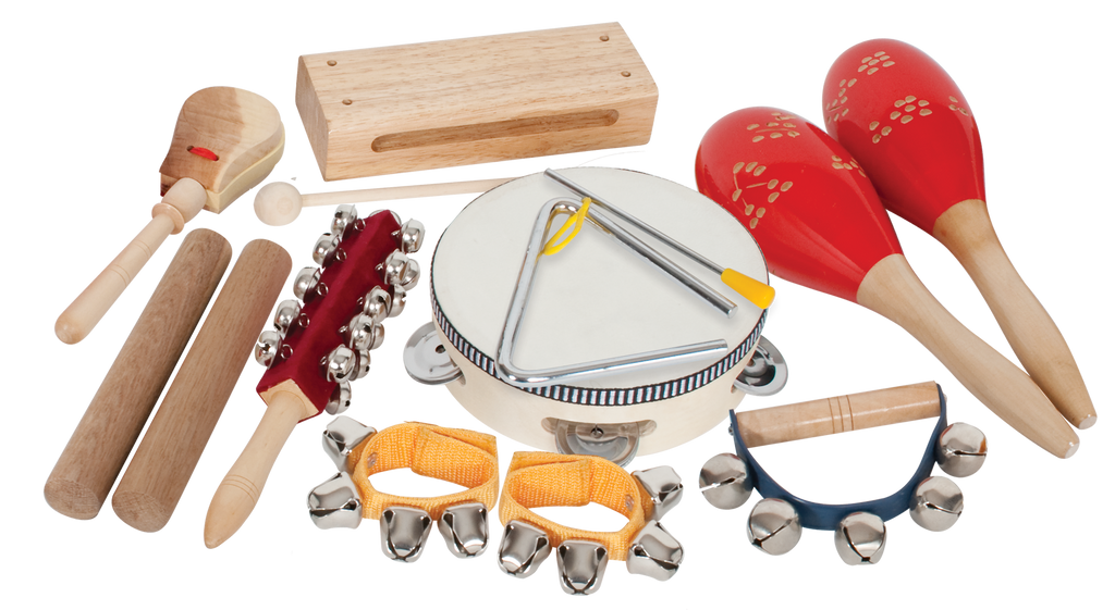 9 piece percussion set with clear vinyl carry bag. Includes 6 inch wooden tambourine with head, wooden handle castanet, 5 bell handbell, 21 bell handbell, 4 1/2 inch triangle with beater and 1 pair each of 7 1/2 inch claves, 10 inch wooden maracas and wrist bells.