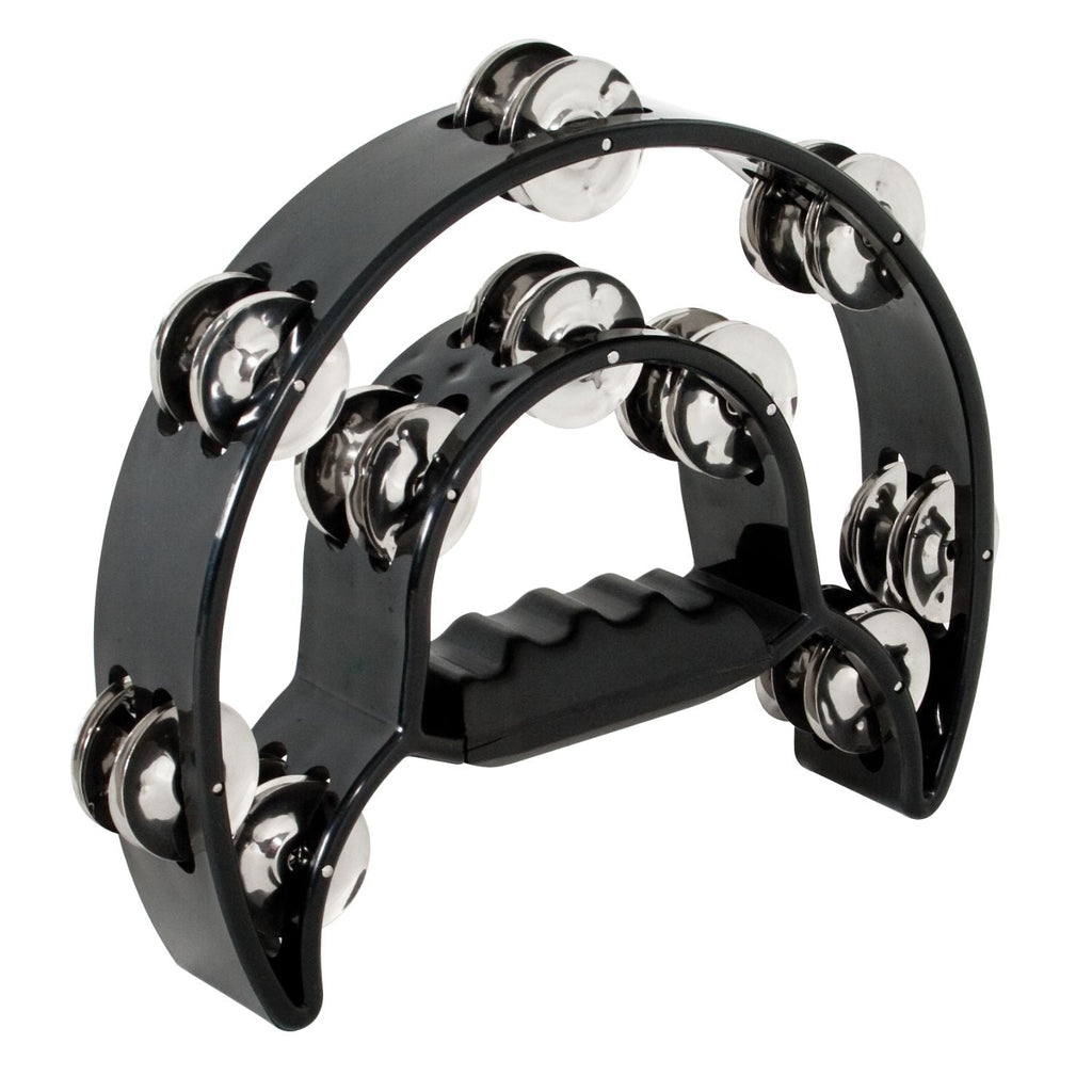 9 inch x 6 inch double half moon tambourine. ABS rim. 20 pairs of nickel silver jingles in double row.