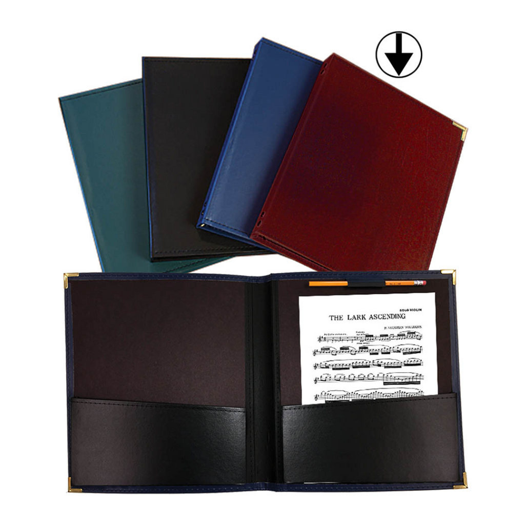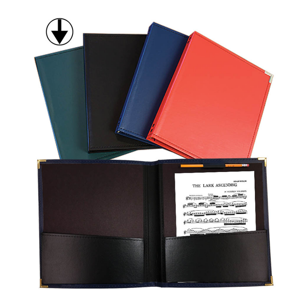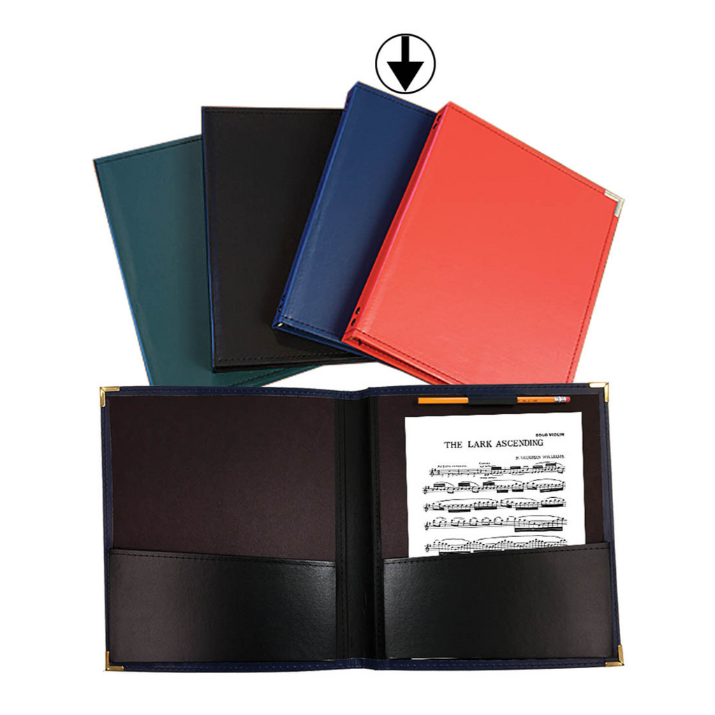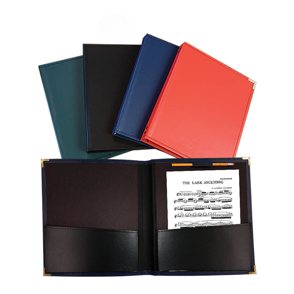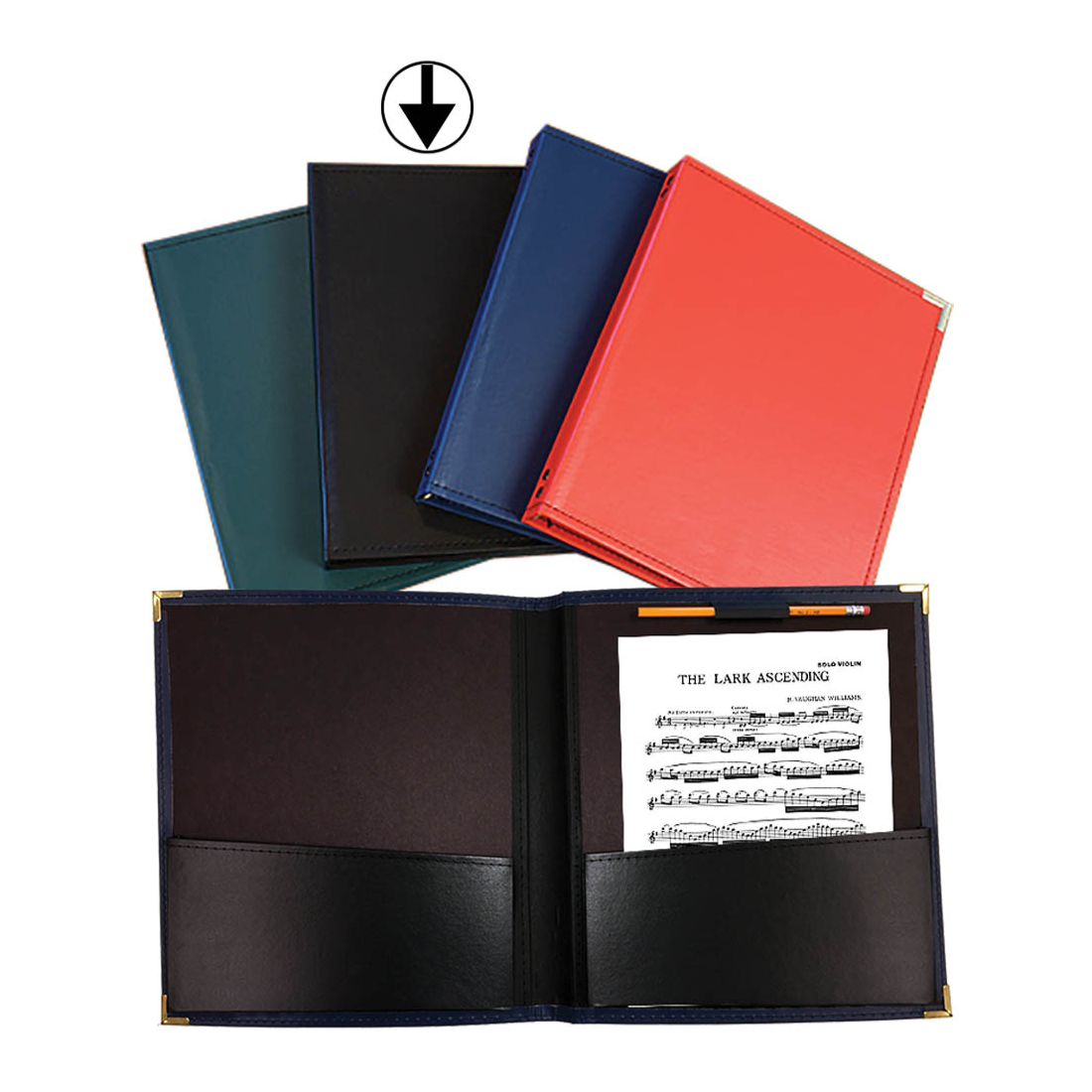 This band & orchestra rehearsal folder is designed with durability in mind. Great for schools, churches, and professional groups. These folders incorporate water resistant cover material, reinforced deep gusset pockets and spine, stitched edging, brass corners, and an internal pencil loop. Available in Black, Green, Red, Blue & Burgundy. Size is 12" x 14".