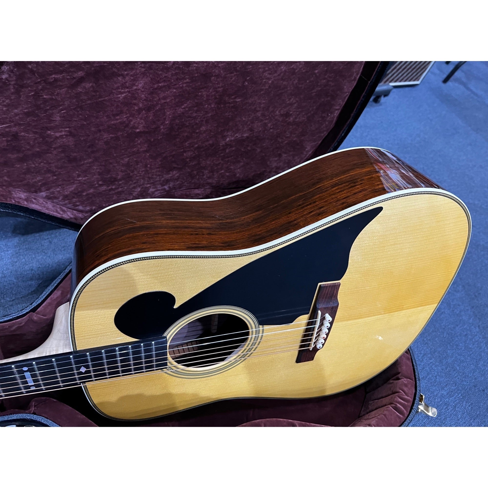 Specifications Model: D-28M Merle Travis Label: Paper Label Signed By CFM IV, Thom Bresh & Fred Gretsch, Numbered In Sequence With Total (66 of 100) . Construction: Standard; Mahogany Blocks, Dovetail Neck Joint Body Size: D-14 Fret Top: Adirondack Spruce Top Braces: Adirondack, Scalloped 5/16'', Golden Era Pattern: Domle #3A Bridge Plate: Maple Top Binding: 6/32'' Grained IvoroidTop Inlay: Fine Herringbone Rosette: Style 28, Black And White Fiber Additional Rosette Inlay: .041'' Grained Ivoroid Pickguard: Black, Self Adhesive, Unique Travis Shape Back: Solid Madagascar Rosewood (Sitka Golden Era Braces) Purfling: HD Zig-ZagBack Binding: 6/32'' Grained Ivoroid Back Inlay: .030'' Black And White Fiber Sides: Solid Madagascar Rosewood Endpiece: Grained Ivoroid Endpiece Inlay: .030'' Black And White Fiber Neck: Multi-Piece Curly Maple Replica Of Original Bigsby Neck Neck Shape: Low Profile Headstock: Unique Merle Travis Shape Truss Rod: 2-Way Adjustable Heelcap: Grained Ivoroid Nut: Bone Headplate: Figured Walnut Headplate Decal: Small Old Style (On Back Of Headstock) Headplate Pearl: Solid mother of pearl Bigsby Inlay To Match Original Tuning Machines: Grover Nickel 136N6 Vintage Deluxe 6-In-Line Kluson Style Fingerboard: Black Ebony Radius: 16''Scale Length: 25.4''Width At Nut: 1-11/16''Width At 12th Fret: 2-1/8'' Frets Clear: 14Total Frets: 20 Pearl Inlay: Unique Solid mother of pearl Heart, Club, Diamond & Spade Design Side Dots: White Boltaron Finish Body Package: Gloss Finish Top: Gloss Finish Neck Package: Satin With Polished HP Bridge: Brazilian Rosewood Style: Standard Belly String Spacing: 2-1/8'' Saddle: 16'' Radius, Compensated, Bone Strings: MSP 4200 Medium Phosphor Bronze Bridge Pins: Bone With 3.0mm Tortoise Dots End Pin: Bone With 4.0mm Tortoise Dot Case: 545E Cabernet