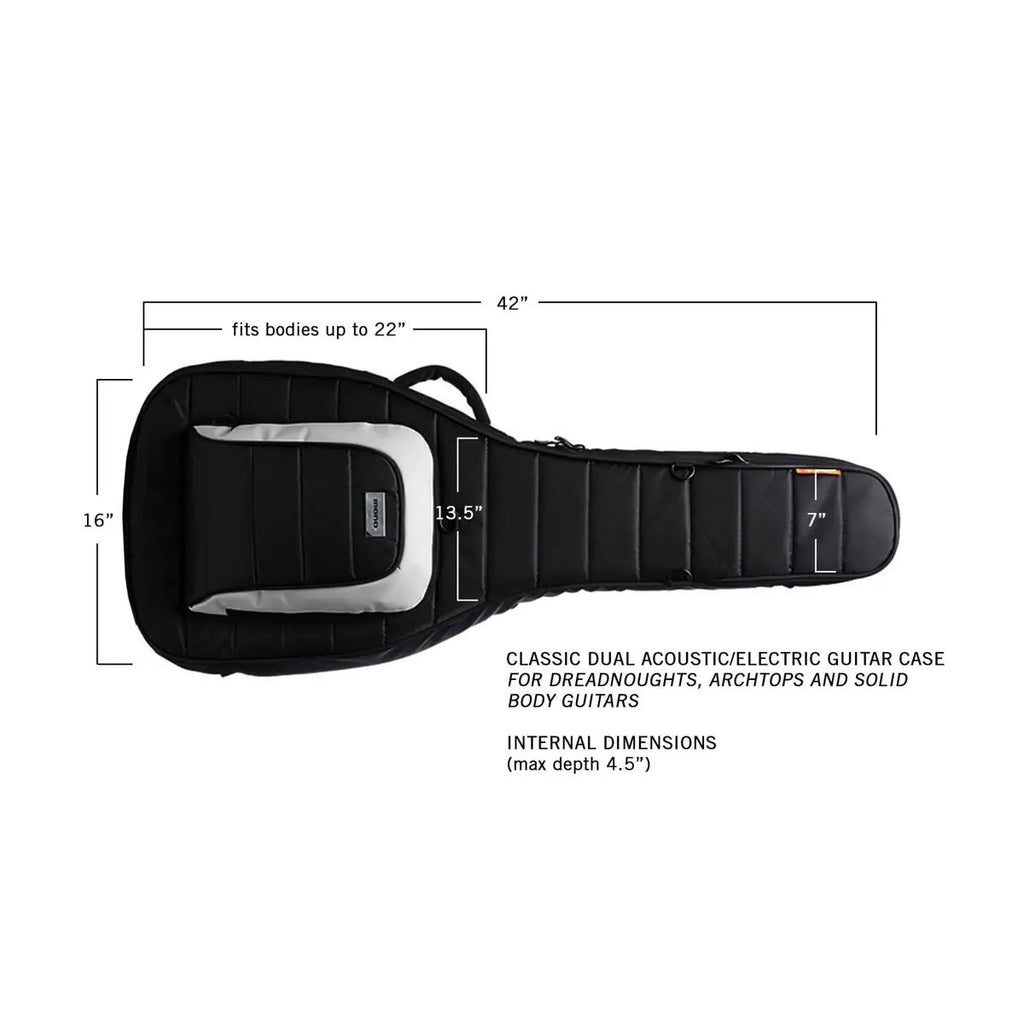 Now it is finally possible to carry one solid body electric and one acoustic dreadnought guitar at the same time, both fully protected with MONO’s patented Headlock® neck suspension system. The acoustic side will also accommodate most archtops and semi-hollows. The first of its kind. Go play.