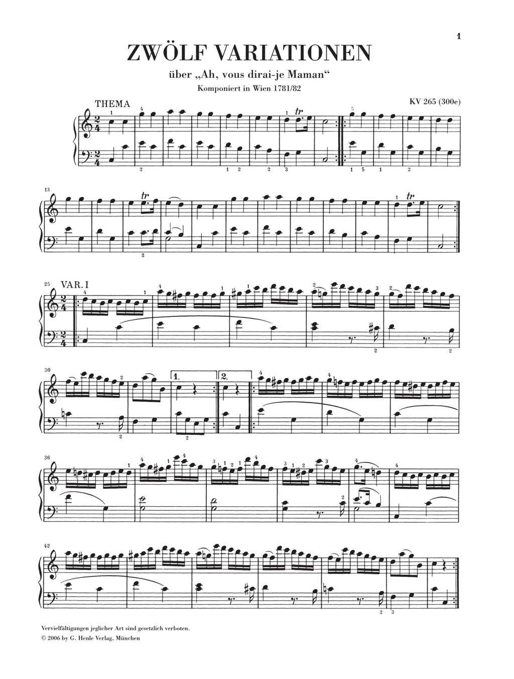 nly very few piano works have become as popular as this theme with twelve variations. It already caught on soon after Mozart’s death, as witnessed by the numerous handwritten copies and prints. Although nothing is known with any certainty regarding its genesis, we can now conclusively date “Ah, vous dirai-je Maman” to 1781. At that time Mozart wanted to make his way as a prominent piano teacher in Vienna. His variations still prove to be excellent teaching material. Our edition has been completely revised and also offers an extremely informative preface by the Mozart specialist Ulrich Konrad.
