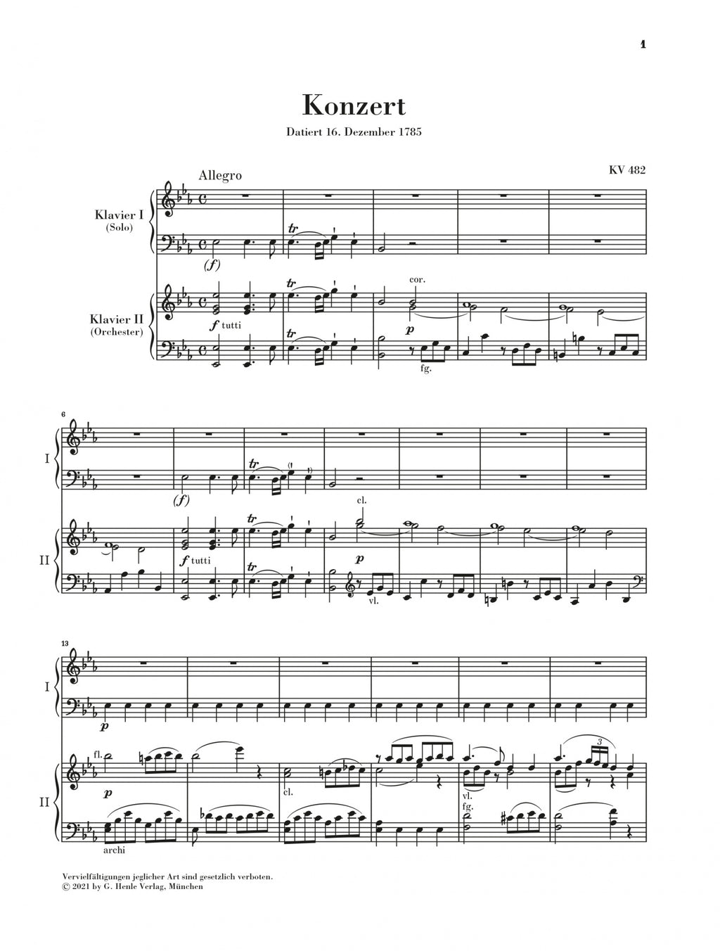 Composed at the end of 1785, Mozart’s Piano Concerto in E-flat major forms a triumvirate with the two famous concerti in A major K. 488 and in C minor K. 491, which he completed in March of the following year. What they all have in common is Mozart’s use of clarinets in the orchestra for the first time. In this he succeeded to particularly impressive effect with the lyrical passages in the slow sections of the E-flat-major concerto, which was well received by the audience at the first performance. Indeed, his father, Leopold, reports in a letter that Mozart “had to repeat” the Andante immediately. In addition to the study edition of this concerto, undeservedly overshadowed by its famous siblings, we are issuing the piano reduction, with cadenzas and fingerings by the magnificent Swiss pianist Alexander Lonquich.