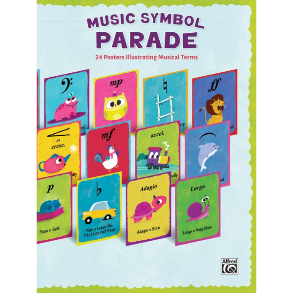 24 Posters Illustrating Musical Terms. These adorable 9" x 12" cardstock posters are more than just a delightful decoration---they're also a fabulous teaching tool! Playful illustrations depict music signs and symbols, while concise definitions clearly explain each term. A tiny mouse represents pianissimo, a lion roars for fortissimo, a snail is largo, and a hammer shows marcato. Dynamics, articulations, tempo headings, clefs, accidentals, and more are also included. Educational and entertaining!