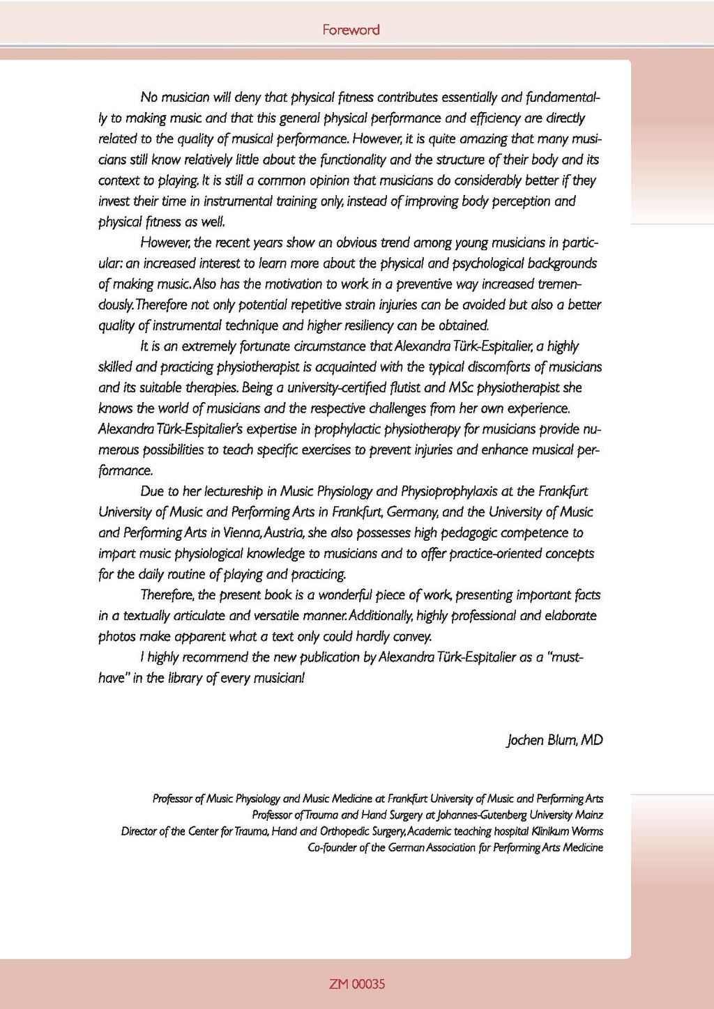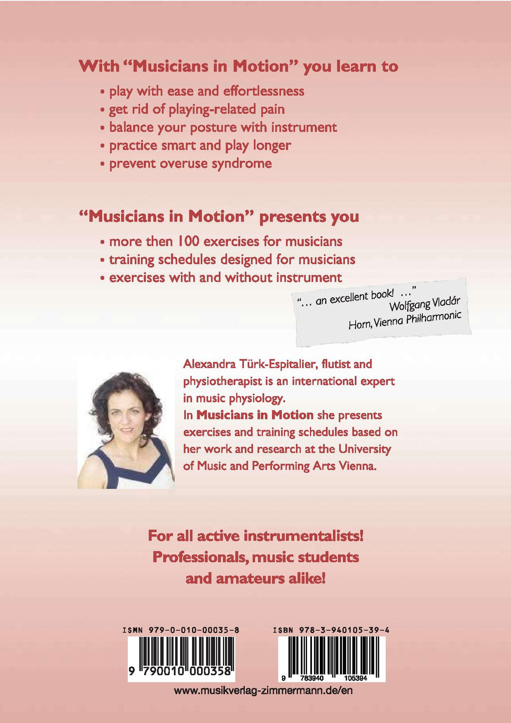 This book is aimed at active instrumentalists regardless of their playing level and provides solutions for all those who want to improve their endurance and performance on the instrument. These solutions will help to prevent problems and pain while playing music. The focus of the book is on practical exercises, but theoretical foundations are also addressed. The book is designed to help you prepare for the demands that playing music can make on your body. It helps you to employ all resources and possibilities in order to remain healthy and to perform at your peak condition. Alexandra Türk-Espitalier is a flutist, physiotherapist and Senior lecturer at the Universität für Musik und Darstellende Kunst Wien.