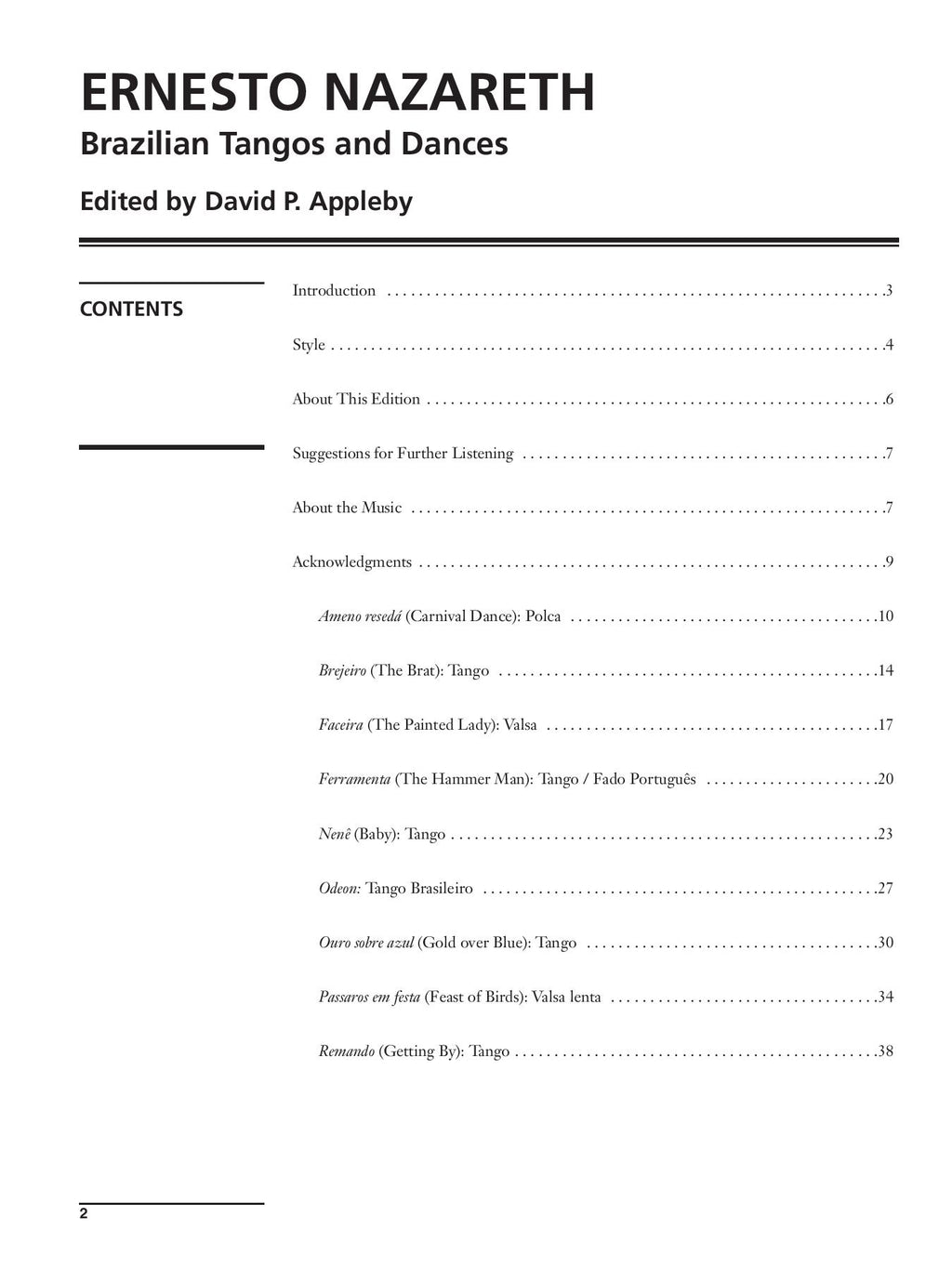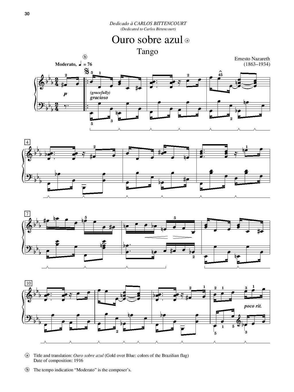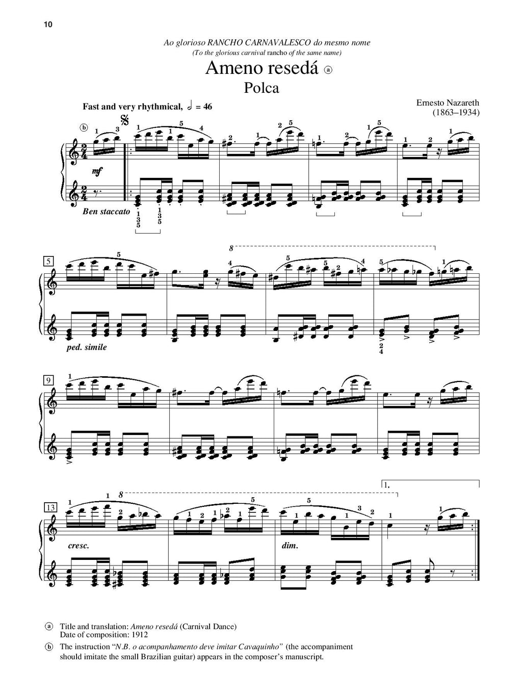 Brazilian pianist/composer Ernesto Júlio de Nazareth (1863-1934) composed approximately 210 works for the piano. His tangos "Brejerio" and "Odeon" were immensely popular during his lifetime and continue to be two of the most popular pieces ever written by a Brazilian salon composer. Written for late intermediate to early advanced level pianists, both are included here, along with four other tangos, two waltzes, and a charming polka, "Ameno resedá". Nazareth's position in Brazilian music is often compared with Scott Joplin's historical importance in American music. 40 pages.