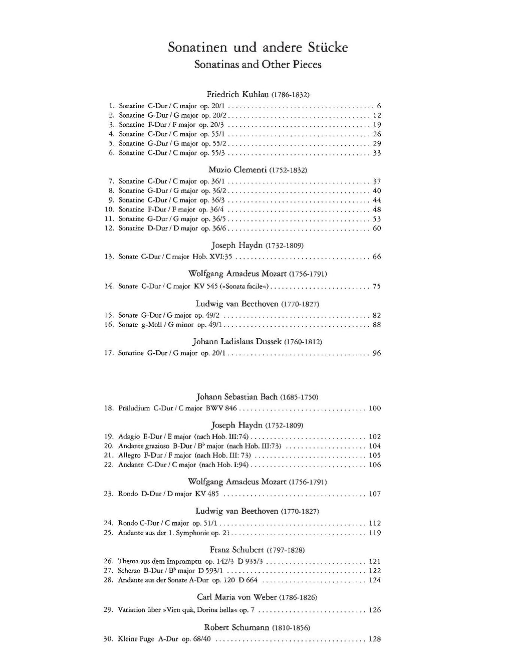 This collection of 'Sonatinas' (literally, 'little sonatas') from some of the greatest Classical composers is a perfect introduction to slightly larger musical structures for advancing early-years pianists. Contains famous and less-well-known pieces from Mozart, Haydn, Beethoven and their contemporaries.