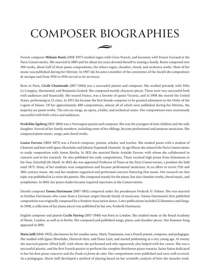 MÉLANIE BONIS: Grand Spanish Waltz in A Major • It's Raining! CÉCILE CHAMINADE: Little Waltz in B-flat Major from Children's Album (Volume 2), Op. 126, No. 12 • Melancholy from Two Pieces, 25, No. 1 FREDRIKKE EGEBERG; Song Without Words in E-flat Major from Six Songs Without Words for Piano LOUISE FARRENC: Etude in F Major from 25 Intermediate Studies, Op. 42, No. 5 • Etude in G Major from 12 Studies in Dexterity, Op. 41, No. 2 • Melody in A-flat Major EMMA HARTMANN: Piano Piece in A-flat Major from Piano Pieces, Op. Posthumous, No. 4 CÉCILE HARTOG: Summer Song MARIE JAËLL: Friendly Teasing from The Good Days • The Shepherd and the Echo from The Good Days • Whispers of the Forests from The Good Days NATALIA JONATHA: Edelweiss JOSEPHINE LANG: Homesickness from Three Piano Pieces • Minuet: Sadness from Three Piano Pieces KATE LODER: Mazurka in A minor MARIANNA MARTINES: Allegro from Sonata in A Major EMILIE MAYER: Impromptu in A-flat Major, Op. 44 FANNY MENDELSSOHN: Melody in E-flat Major from Six Melodies for the Piano, Op. 5, No. 6 • Larghetto from Four Songs for the Piano, Op. 8, No. 3 ADELE AUS DER OHE: A Legend from Four Piano Pieces, Op. 9, No. 1 FANNY SCHOLFIELD PETRIE: Sorry • Joy DELPHINE VON SCHAUROTH: Song Without Words in E minor from Six Songs Without Words, Op. 18, No. 4 CLARA SCHUMANN: Romance in A minor, WoO 28 (1892 version) ANNA STUBENBERG: Austrian Dance in A-flat Major from The People of Kapfenberg, Op. 67, No. 5 MARIE SZYMANOWSKA: Polonaise in E minor from 18 Dances in Different Genres for Piano • Quadrille in F Major from 18 Dances in Different Genres for Piano STEPHANIE VRABELY: Pensée musicale