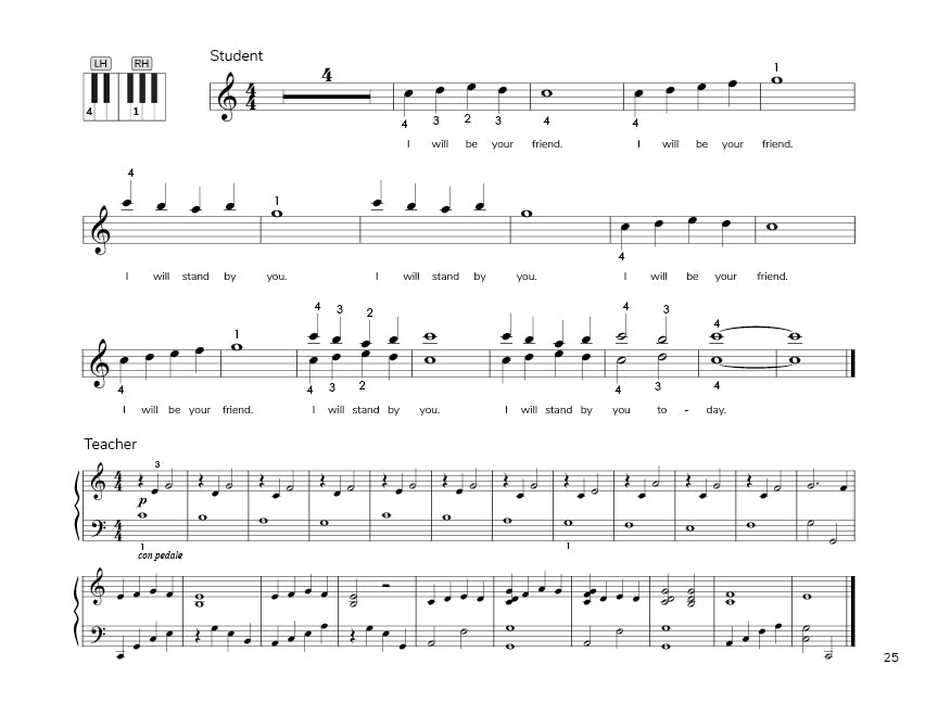 Friends at Last: Tuneful Rote Pieces for the Beginning Pianist is a collection of ten rote pieces woven into a story about what it means to be a friend. This format is perfect for a recital performance with a narrator telling the story and a group of beginning pianists performing the pieces. It is also provides supplemental repertoire for Piano Safari Friends and Repertoire Book 1.