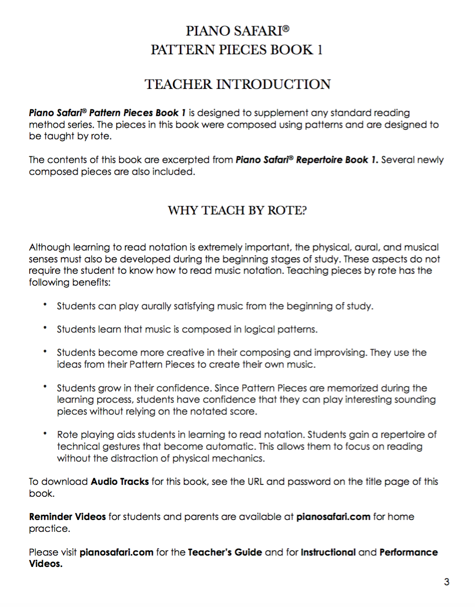 Pattern Pieces 1 contains rote pieces excerpted from Repertoire Book 1, pieces currently published as elementary rote sheets, and newly composed works.