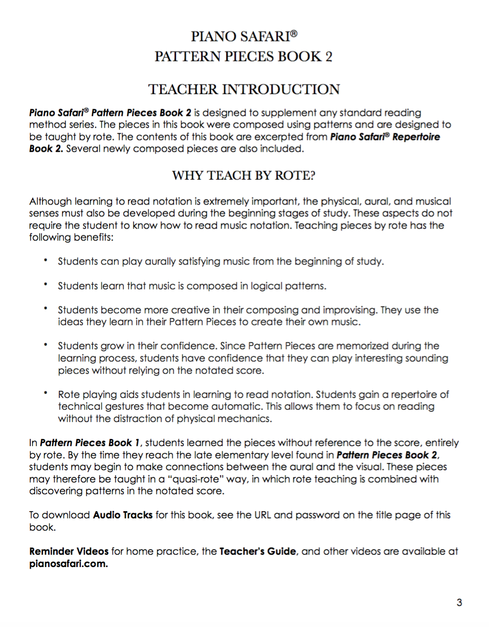 Pattern Pieces 2 is designed to supplement any standard piano method. As the name implies, it contains pattern-based pieces that are to be taught by rote. A code for corresponding digital audio tracks is included in the front of the book.