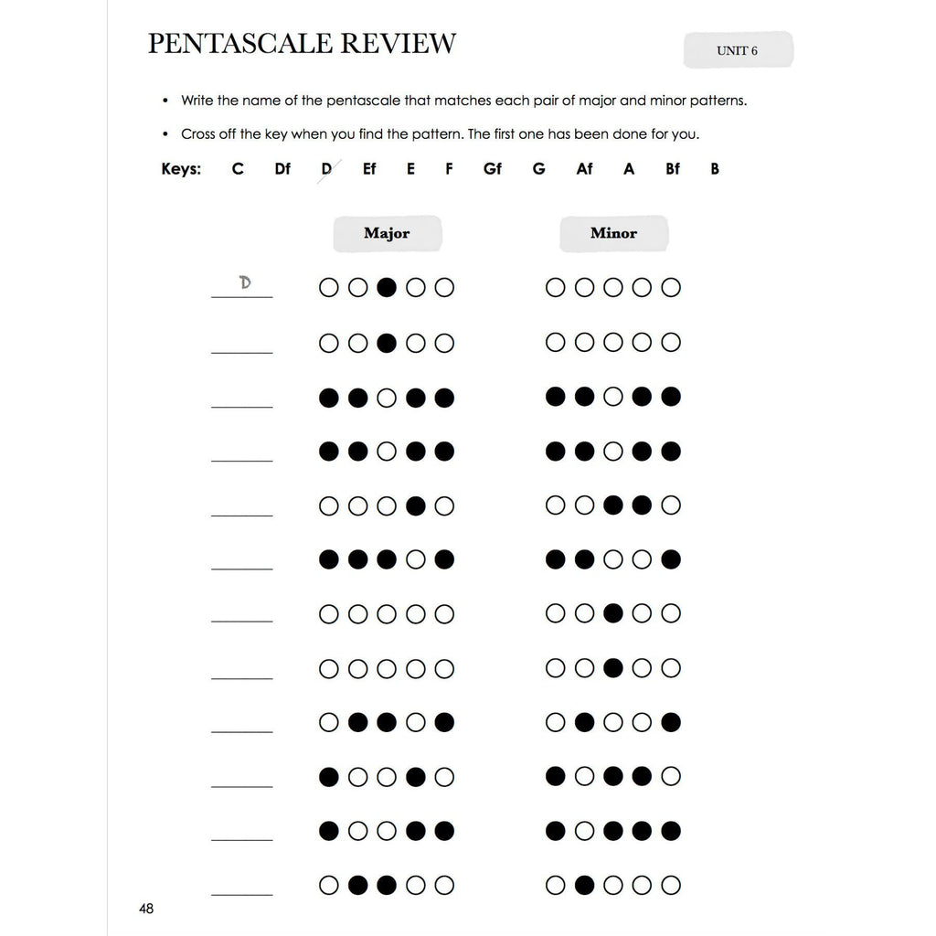 Pentascales Variations The white key major patterns are introduced early in the book and progress to the white key minor patterns. The black key major and minor patterns are presented in Unit 6. Students play with varying rhythms and articulations.