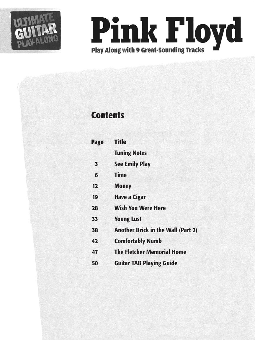 The Ultimate Play-Along series gives you everything you need to jam with your favorite songs. The books contain note-for-note tab transcriptions and access to online audio tracks featuring amazing sound-alike recordings. There are two versions of every song in the audio: an instrumental sound-alike recording and an instrumental accompaniment track without guitar so you can play along. When you use the PLAYBACK+ feature, the TNT (Tone 'n' Tempo) Changer lets you easily loop sections for practice, slow tracks down or speed them up without changing the pitch, change the key, and switch back and forth between the full instrumental and play-along tracks. This edition features 8 Pink Floyd classics, including: Another Brick in the Wall (Part 2) • Comfortably Numb • The Fletcher Memorial Home • Have a Cigar • Money • See Emily Play • Time • Wish You Were Here • Young Lust.