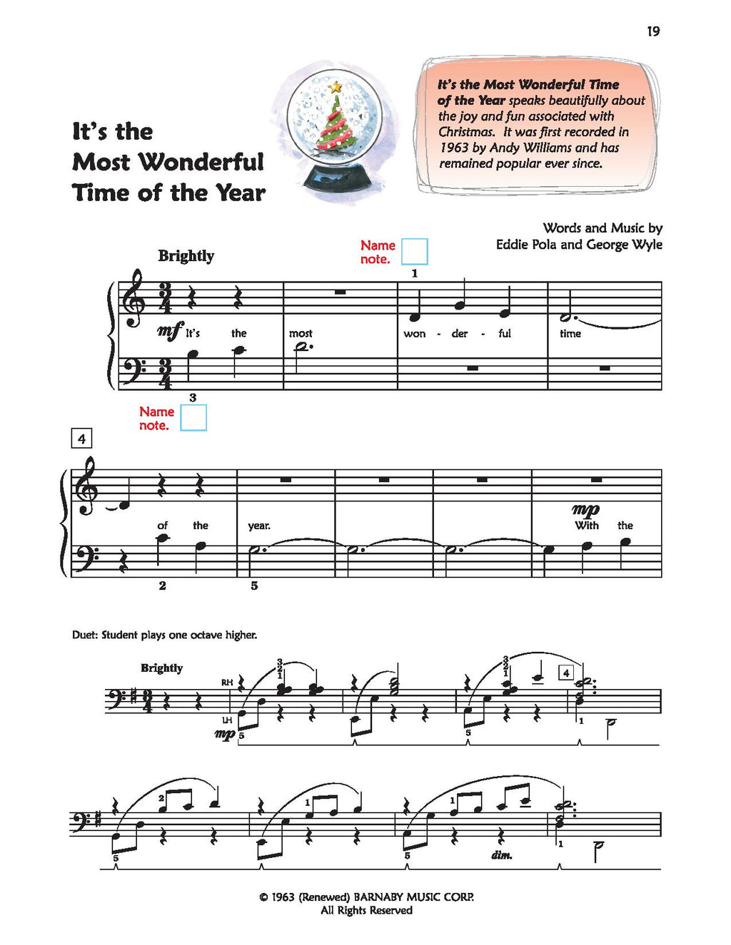 Familiar motivational pieces for the holiday season using the same concepts introduced in the corresponding Lesson Book. Contains teacher duet accompaniments for an enhanced musical experience. Titles: Angels We Have Heard on High * Coventry Carol * Dance of the Sugar-Plum Fairy (from The Nutcracker Suite) * Deck the Halls * God Rest Ye Merry, Gentlemen * It's the Most Wonderful Time of the Year * Jingle Bells * Russian Dance (Trépak) (from The Nutcracker Suite) * Silent Night * Toyland. 24 pages.