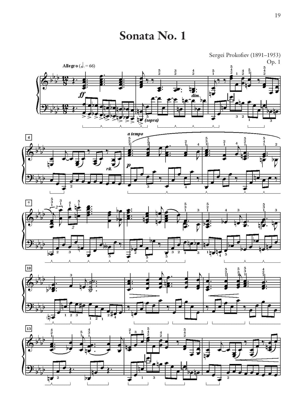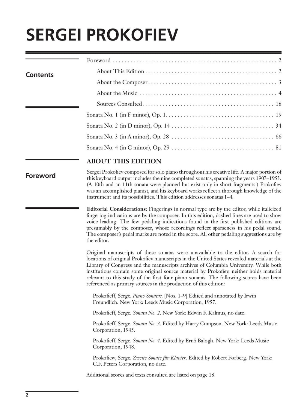 Sergei Prokofiev's nine piano sonatas span the years 1907 to 1953. This collection, edited by Thomas Schumacher, addresses the first four of these masterworks: Op. 1 (in F minor), Op. 14 (in D minor), Op. 28 (in A minor), and Op. 29 (in C minor). In prefatory matter, Schumacher discusses Prokofiev's compositional style and the form of each sonata, in addition to analyzing the various themes and compositional nuances of each work. Helpful fingering and pedaling suggestions are also offered in this comprehensive, clearly engraved edition.