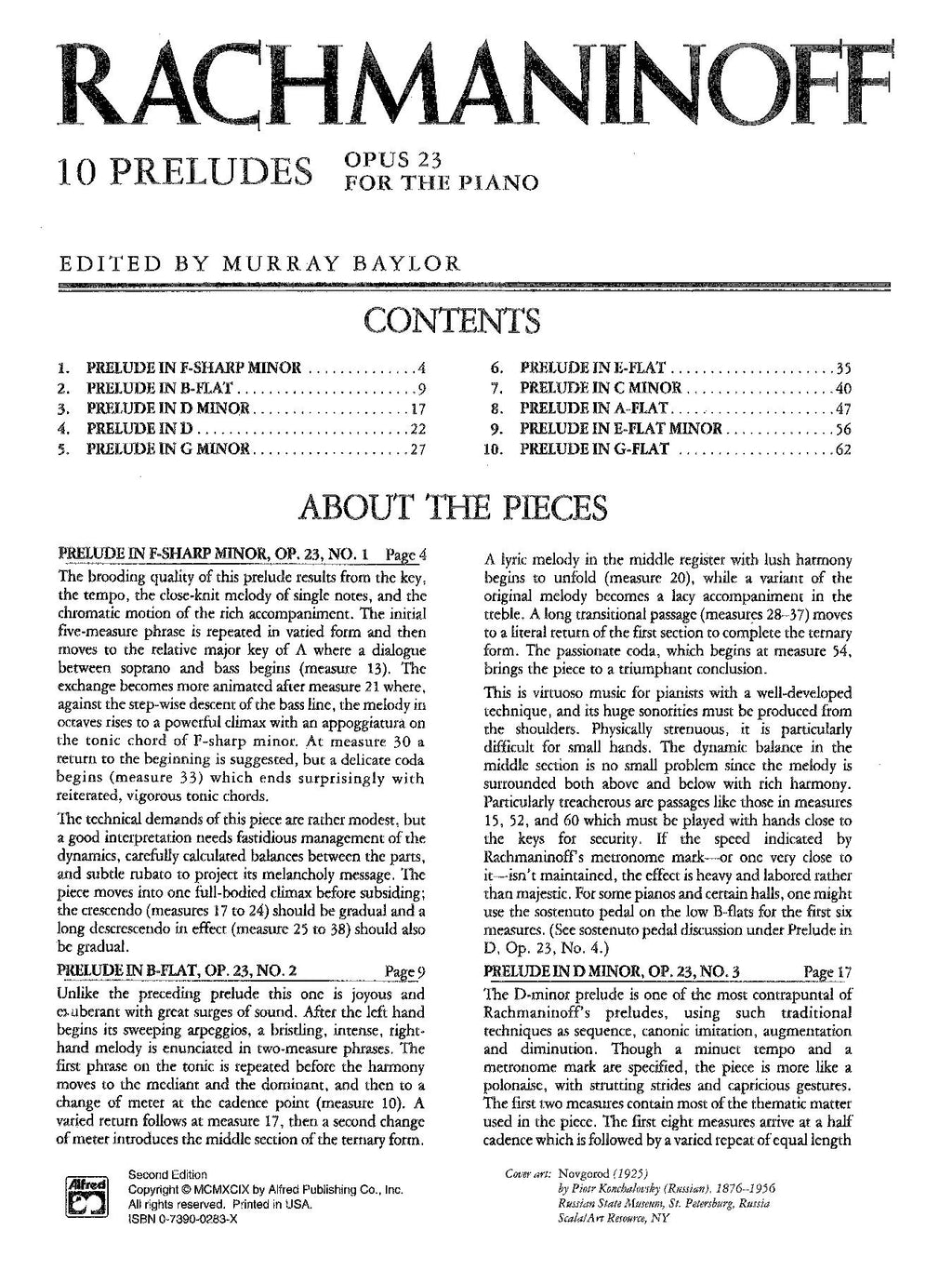 These alluring and varied preludes exhibit the compositional skill, expressiveness and innovation that is characteristic of Rachmaninoff's works. Editor Murray Baylor includes informative performance notes that reveal the background of each piece, highlight difficult passages, and offer suggestions on how to approach the technical demands found in the music. Preludes Nos. 1, 2, 3, 5, 6, and 10 are Federation Festivals 2016-2020 selections. A Federation Festivals 2020-2024 selection.