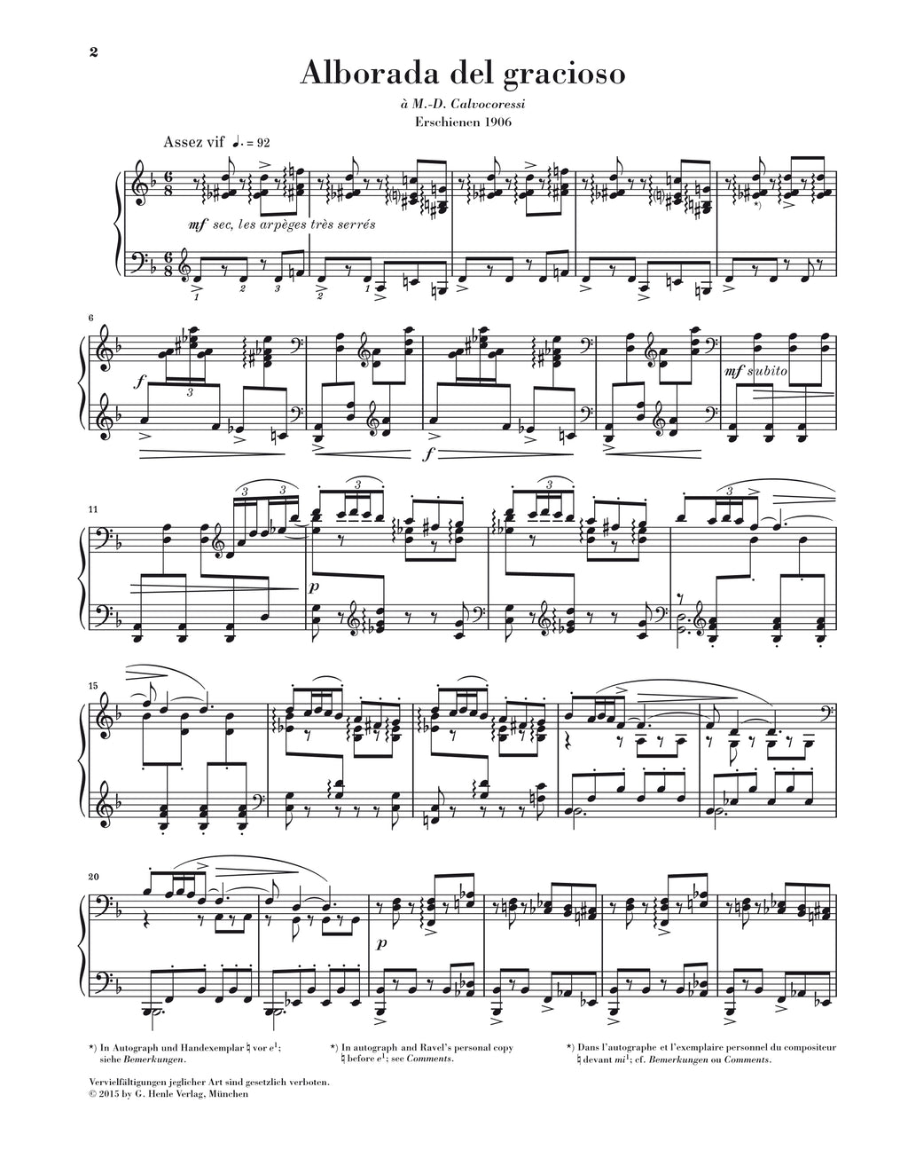 In his “Autobiographical Sketch” Ravel looks back and stresses the importance of his “Miroirs” (HN842), published in 1906, for his harmonic evolution. He said that they had “disconcerted even those musicians who had been most familiar with my compositional style up to then”. This is particularly true of the fourth piece in the collection, “Alborada del gracioso” (Morning song of the court jester), with its frequent employment of harsh dissonances. This both technically and musically charming genre scene, full of rousing ideas and rhythms, is one of the French composer’s best-known piano pieces today. We are now issuing it in a single Urtext edition.